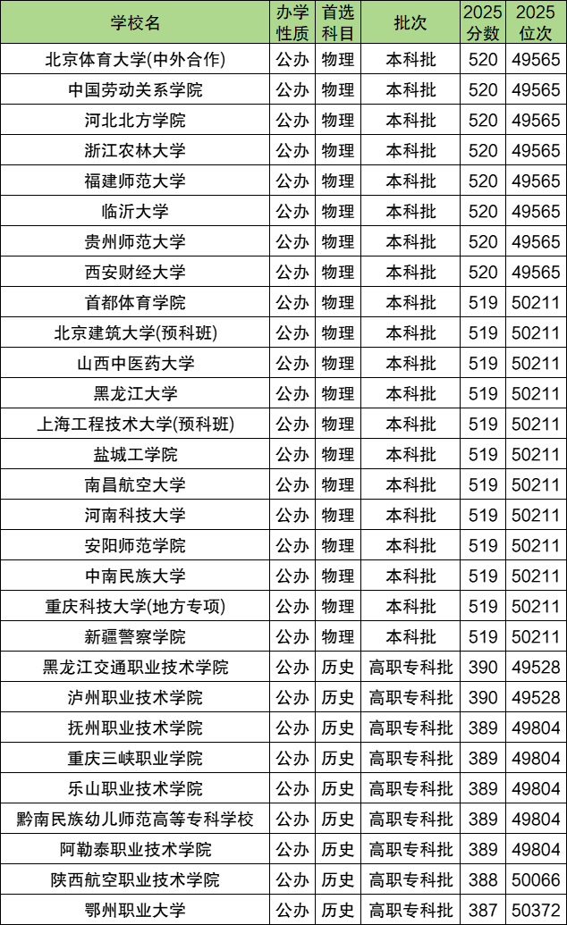 历史类49804名对应抚州职业技术学院、重庆三峡职业学院、乐山职业技术学院等,2025年高考分数为389分;