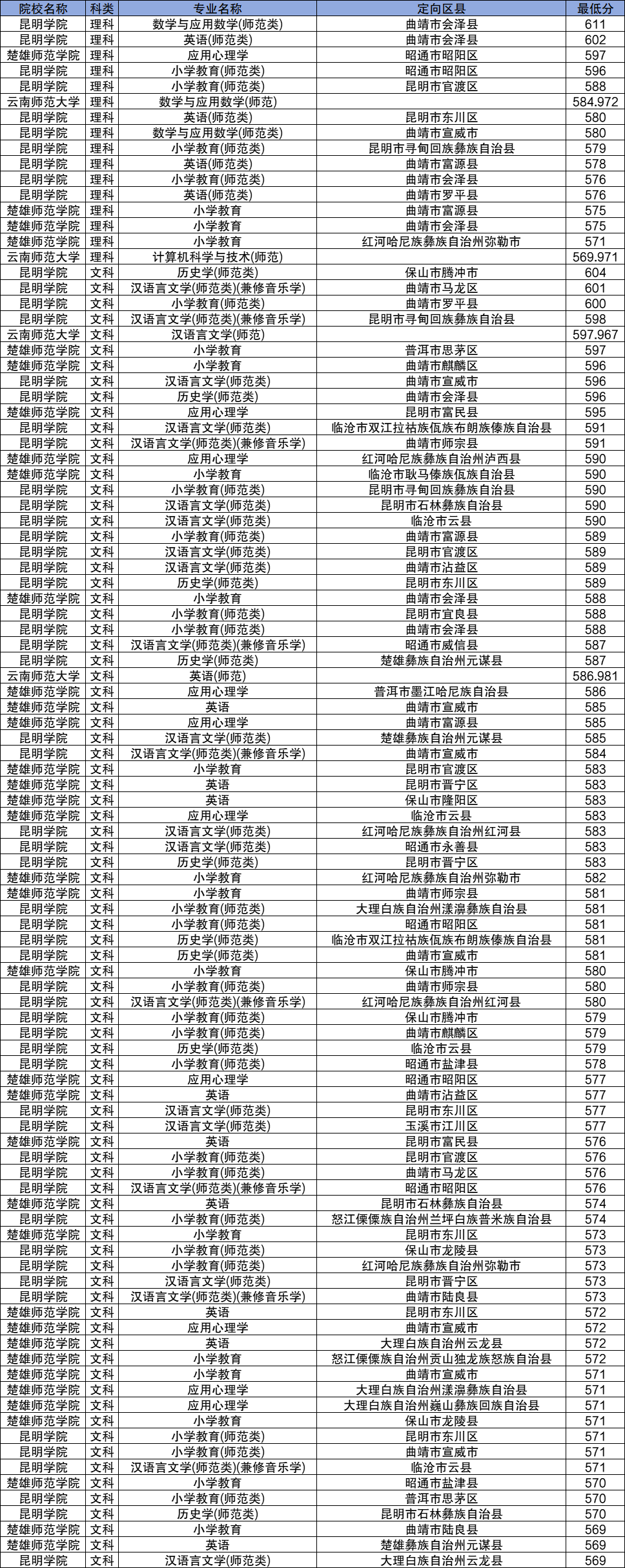 云南省2025年地方公费师范生学校录取分数线Top100一览表: