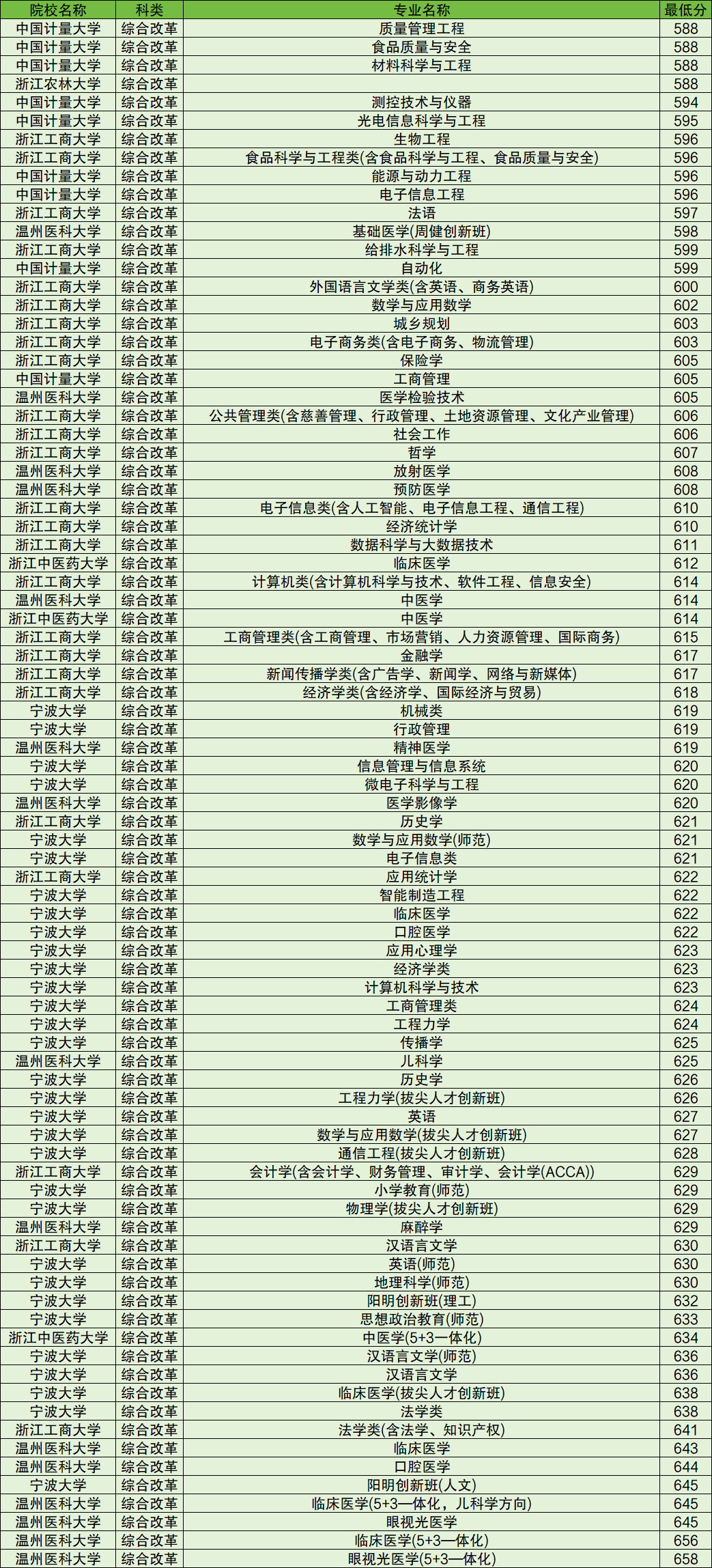 2024年浙江地方专项录取分数线位于588分到658分之间,收分最低的是中国计量大学质量管理工程专业,收分最高的是温州医科大学眼视光医学(5+3—体化)专业,各学校具体分数线如下。