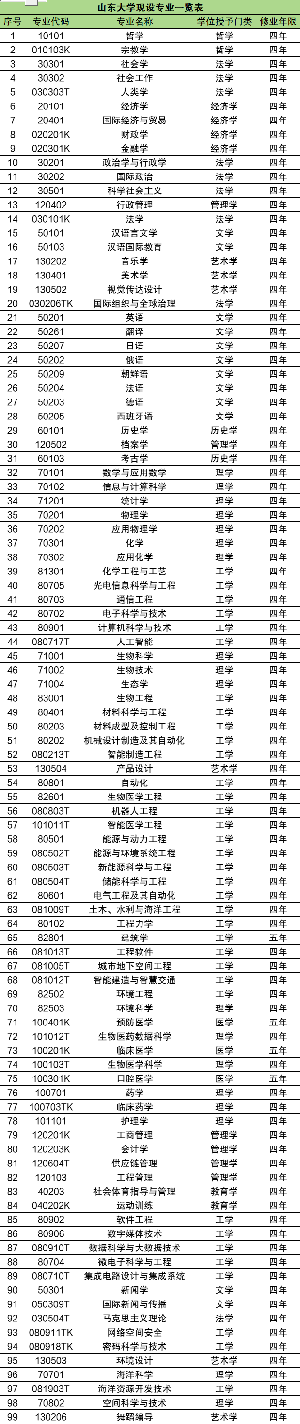 下面附上山东大学现设专业一览表(99个),这些专业都是2025年高考生可以报考的。