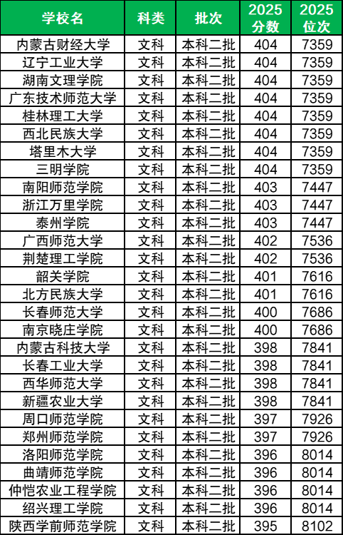小编在此以分数线较低的新疆、广西、甘肃为例,整理了2025年这三个地区400分左右(395分-405分之间)的公办二本大学一览表,新高考地区可将本科线视为二本线,将特控线下的非双一流大学视为二本大学,如下: