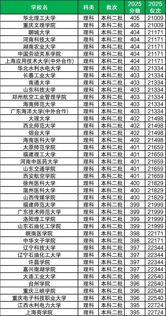 400分左右能上的二本院校有28所,大部分属于实力普通的二本院校,少部分如西北民族大学、北方民族大学为中央部属院校,广西师范大学、塔里木大学、长春工业大学等属于省重点大学。