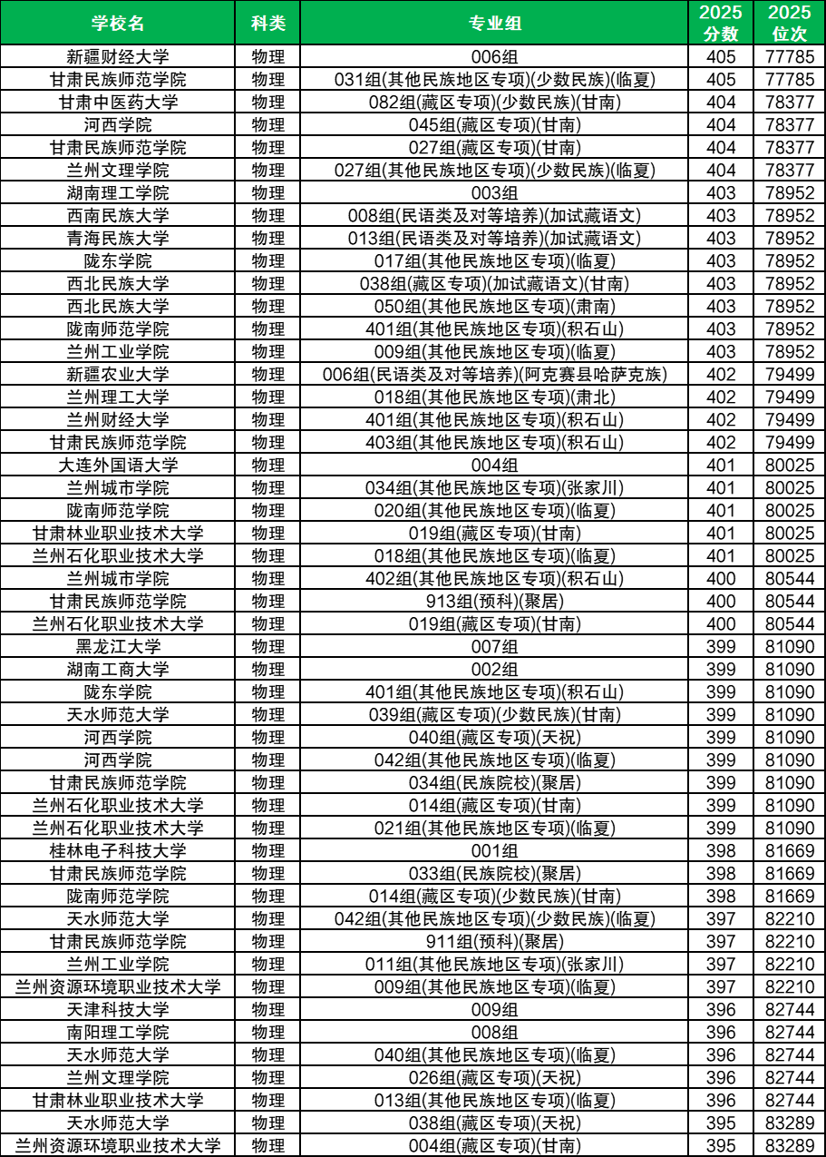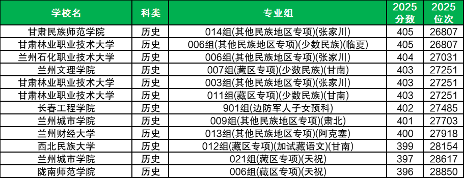 400分左右能上的公办二本院校有9所,均为专项计划专业组,部分考生报考受限。院校包含甘肃民族师范学院、甘肃林业职业技术大学、兰州石化职业技术大学、兰州文理学院等。