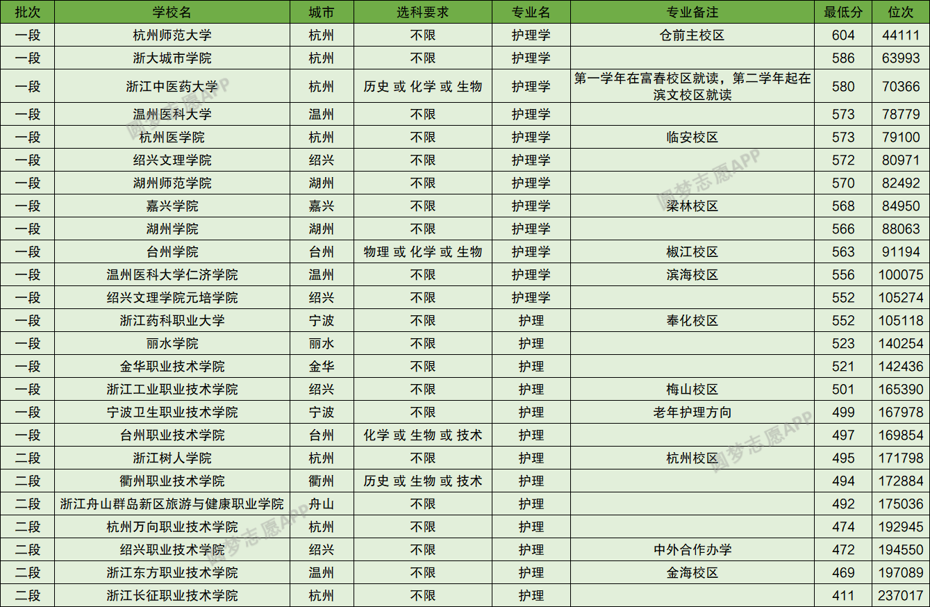综上可知,2023年浙江省想读护理专业的高考生,至少要考到411分才能被录取,而2023年想读护理的浙江高考生,高考成绩在全省的排名至少也得超过237017名才行。