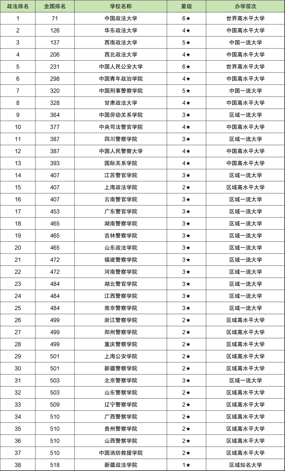 根据校友会2024年政法类院校排行榜来看,中国政法类大学排名为: