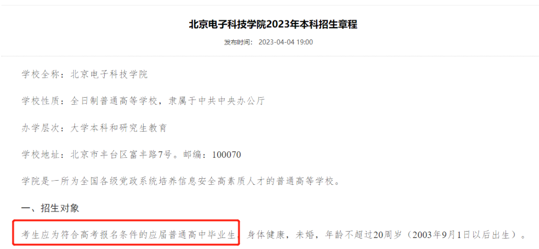 根据2023年北京电子科技学院招生简章可知晓,该校只招收应届高中生,而2022年的招生简章则表明该校招收新生一般为应届高中生。