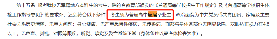 海军军医大学无军籍本科地方招生只收应届毕业生。