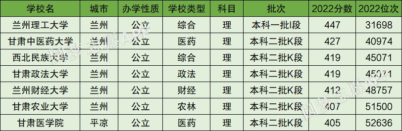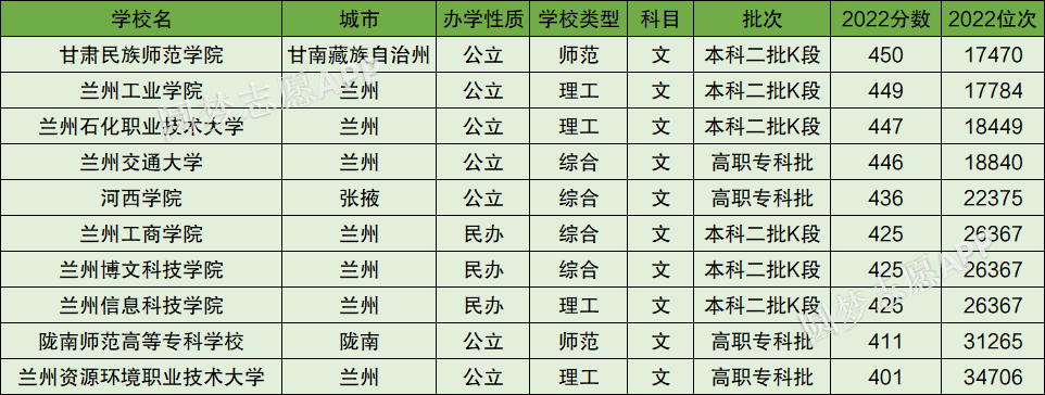 因为本文篇幅有限,不能所有大学都一一罗列,以下为2022年甘肃省内文科分数线在400~450分的大学名单。