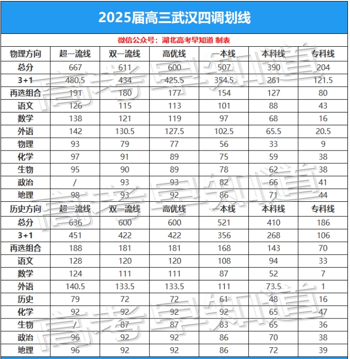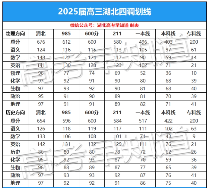 2025武汉四调分数线:本科线物理类390分、历史类410分;2025湖北四调分数线:一本线物理类496分、历史类517分。不管是湖北四调还是武汉四调划线,都是赋分过后的,更多分数线划线及各科有效分如下文所示。