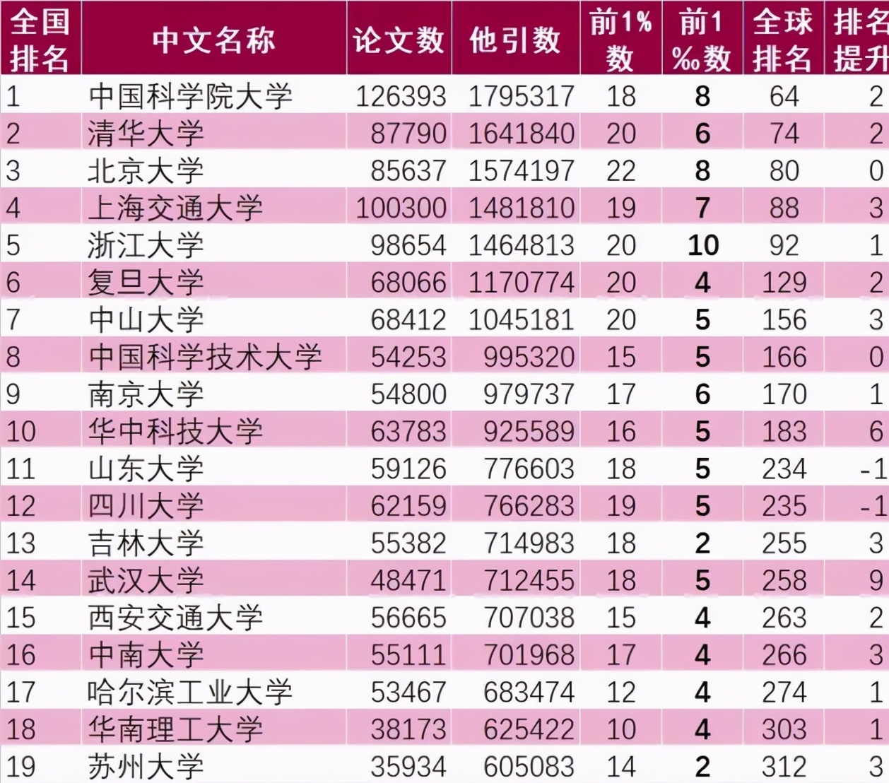 在ESI世界大学排名中国大学中,清华大学并不是排在第一名,而是中国科学院大学。因为ESI是以学校的论文数量和论文被引用次数为排名准标准,并不是以学校的综合实力为标准。所以可以从下文中看出来该排名里,排在前列的大学中以综合类、理工类大学的数量居多。但这起码也说明,在学术科研方面中科大就算不是985大学最好的,那算是顶尖的存在。