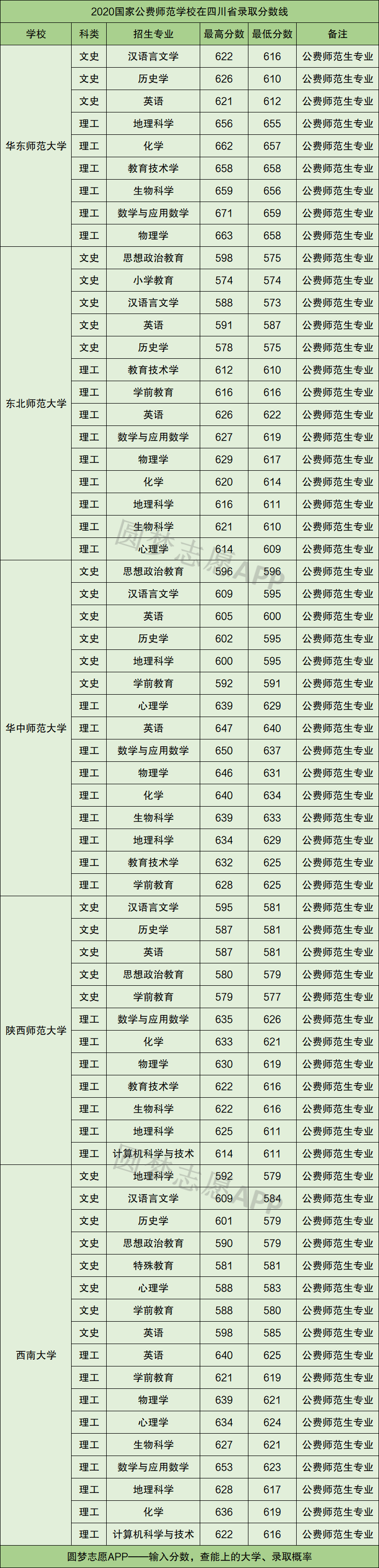为了让大家对免费师范生的分数线有一个更具体的了解,老师下面以四川省为例,为大家整理了部属师范大学2020年在四川省的录取分数线,供大家参考,想要查询其他省份分数线的考生,可下载圆梦志愿APP查询。