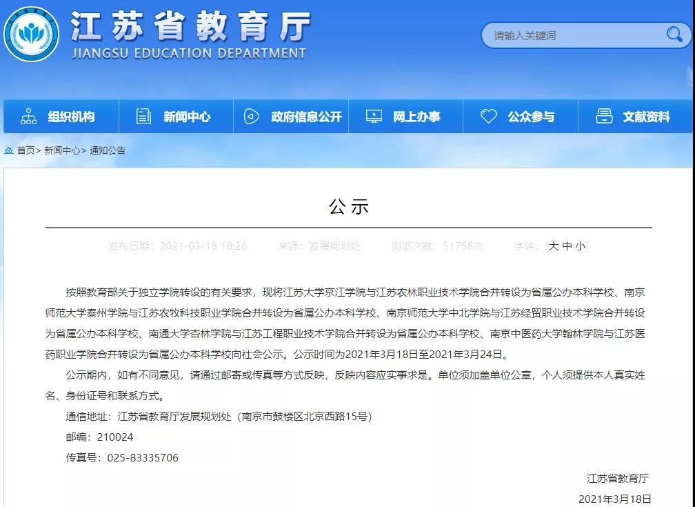 根据江苏省教育厅在2021年3月18日发布的公示文件可知,以下大专将与独立学院进行合并转设,从而成为公办本科大学。