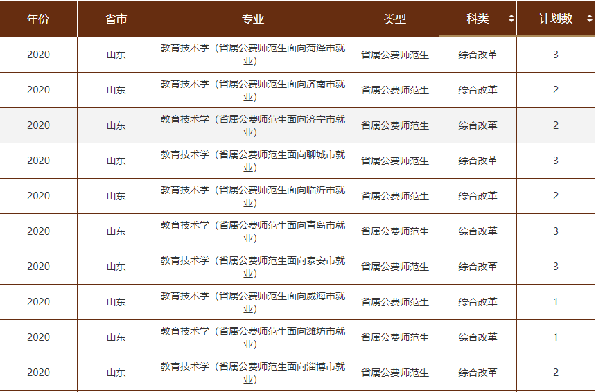 意思就是不同的专业会被分配到不同的地区进行就业,如山东省的曲阜师范大学在2020年公费师范生专业共有教育技术学、地理科学、化学、小学教育、历史学、政治思想教育等12个专业,每个专业所面向的就业地区并不是完全相同,这种情况下就需要各位考生和家长根据自己的实际情况选择专业。下图为曲阜师范大学的部分公费师范生招生专业。
