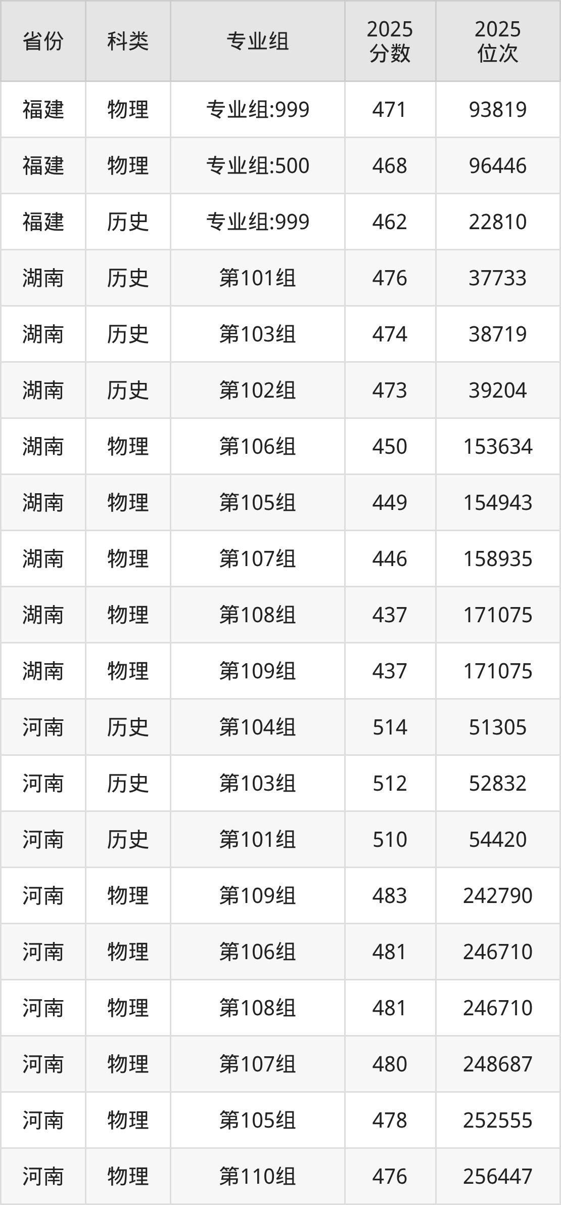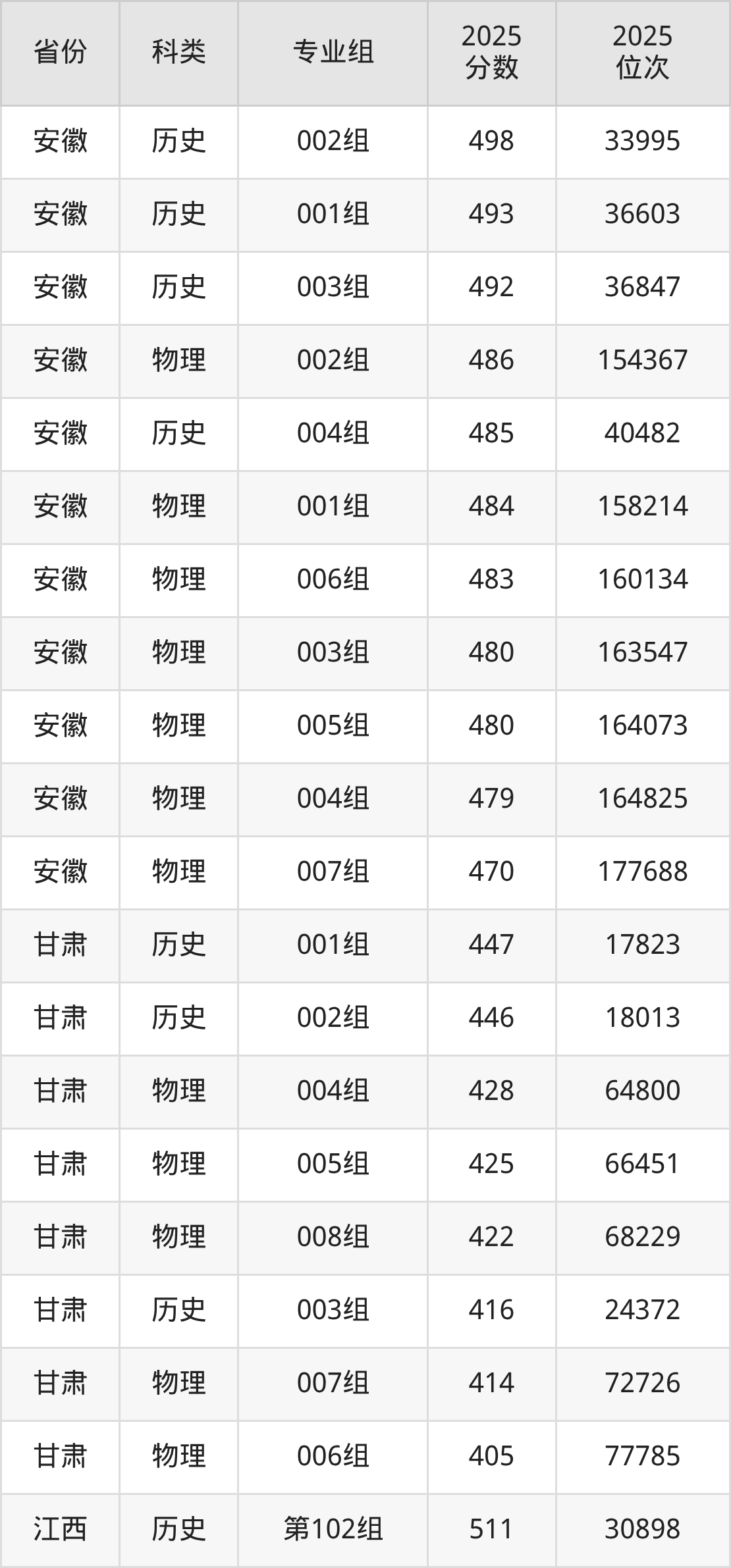 5、甘肃:最低分405分,对应最低分专业组为物理类006组,位次77785名;