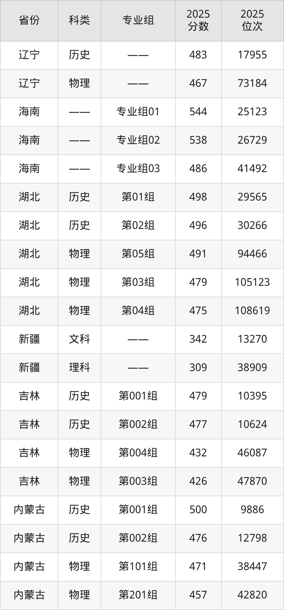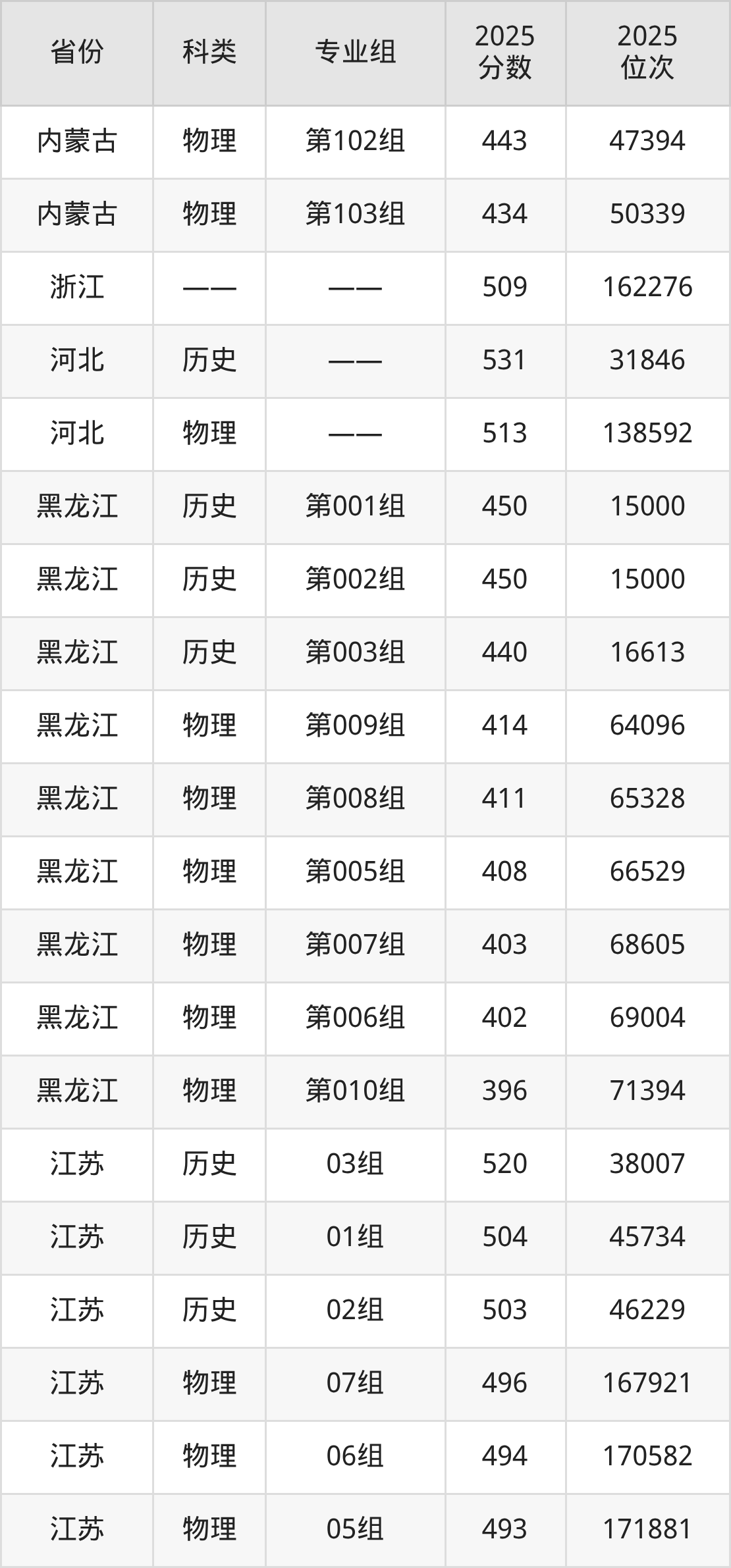 3、黑龙江:最低分396分,对应最低分专业组为物理类第010组,位次71394名;