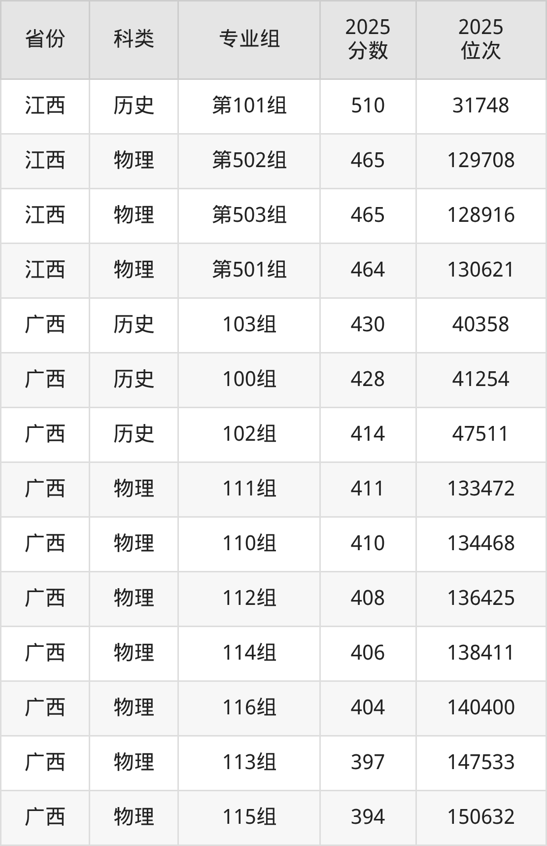 2、广西:最低分394分,对应最低分专业组为物理类115组,位次150632名;
