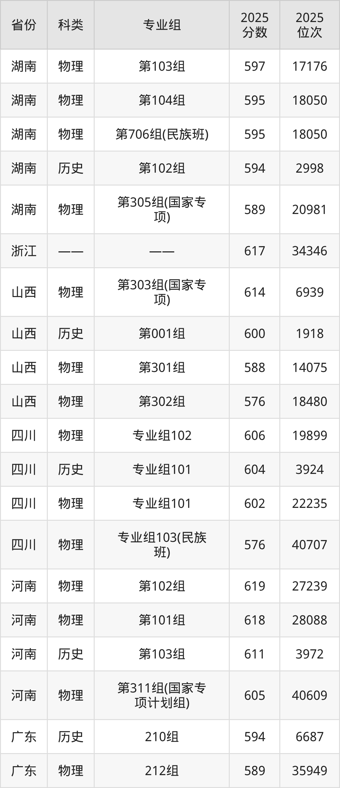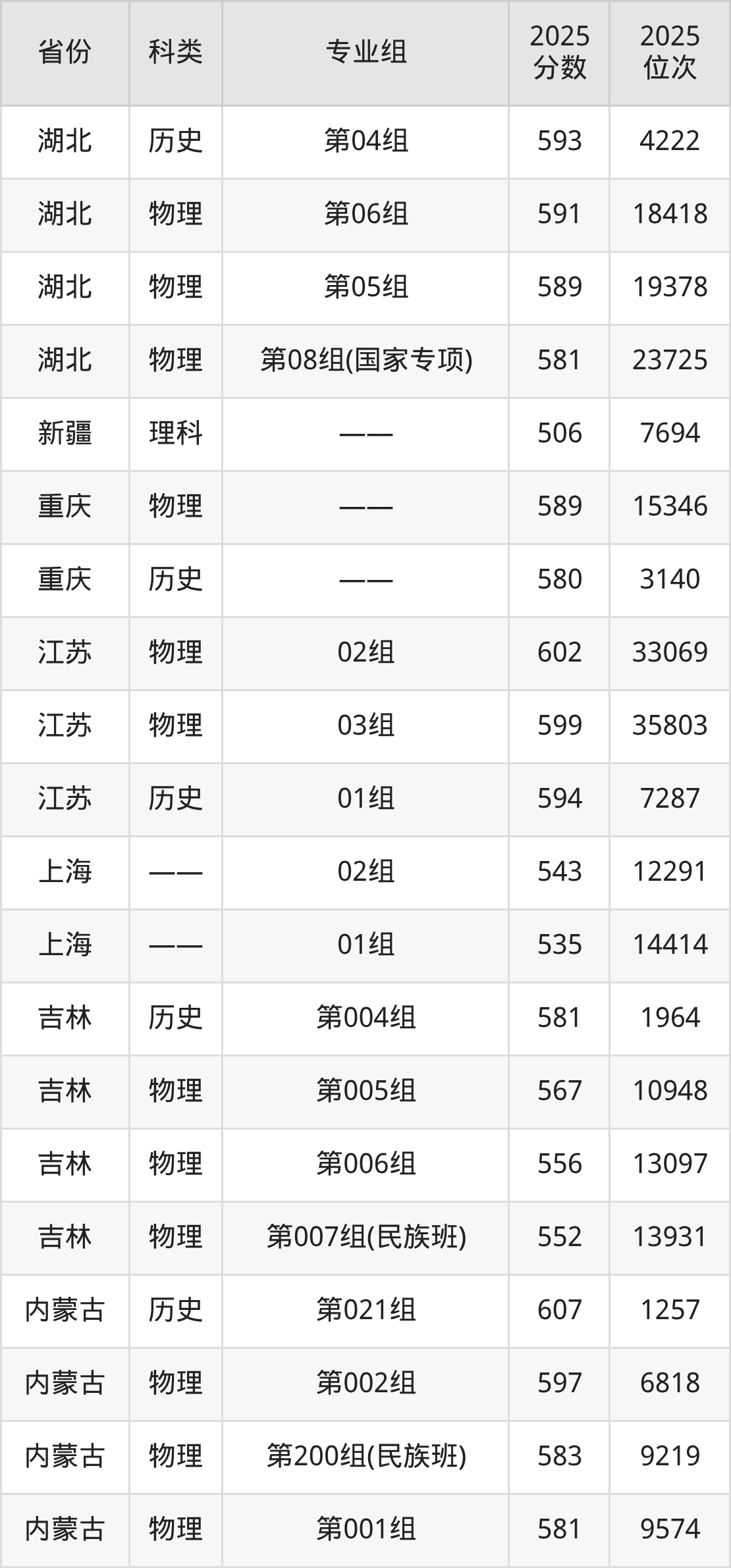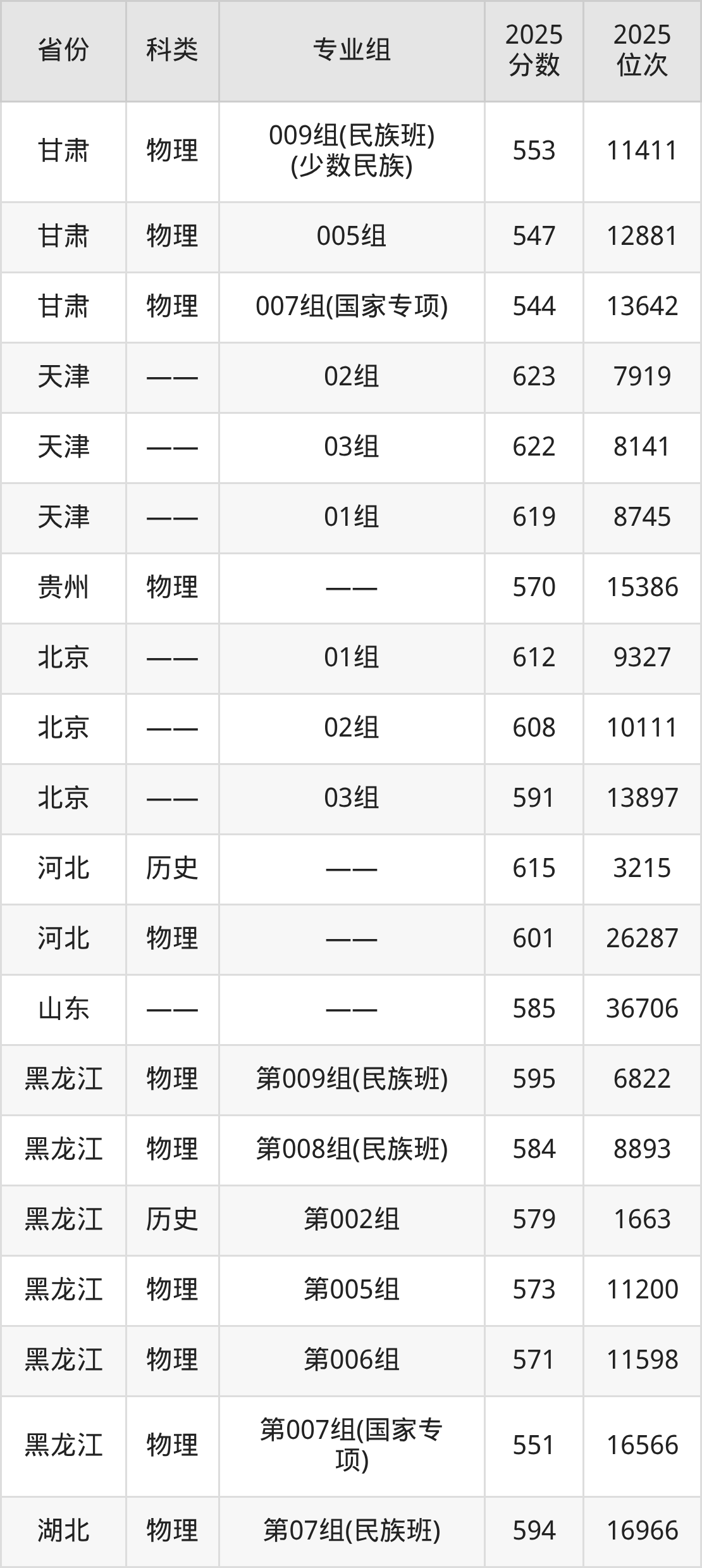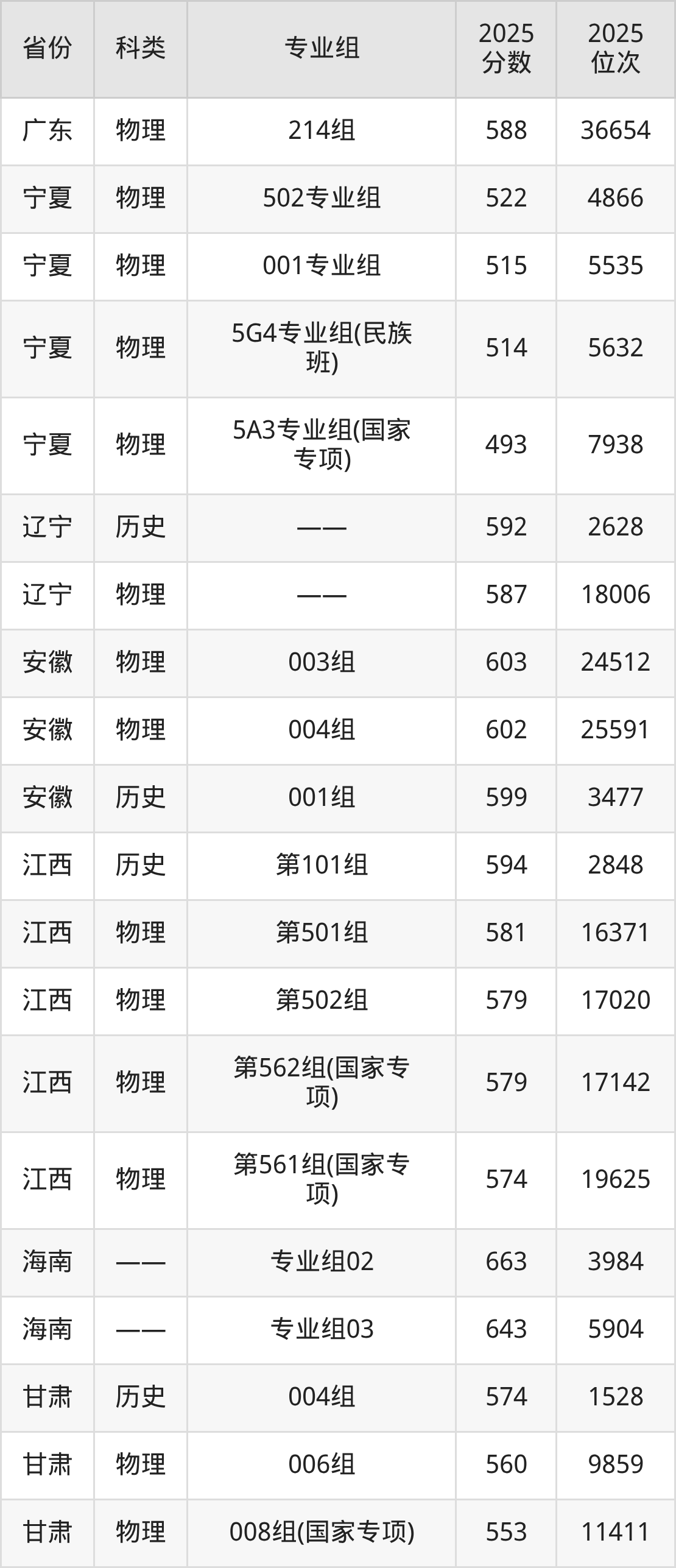5、甘肃:最低分544分,对应最低分专业组为物理类007组(国家专项),位次13642名;