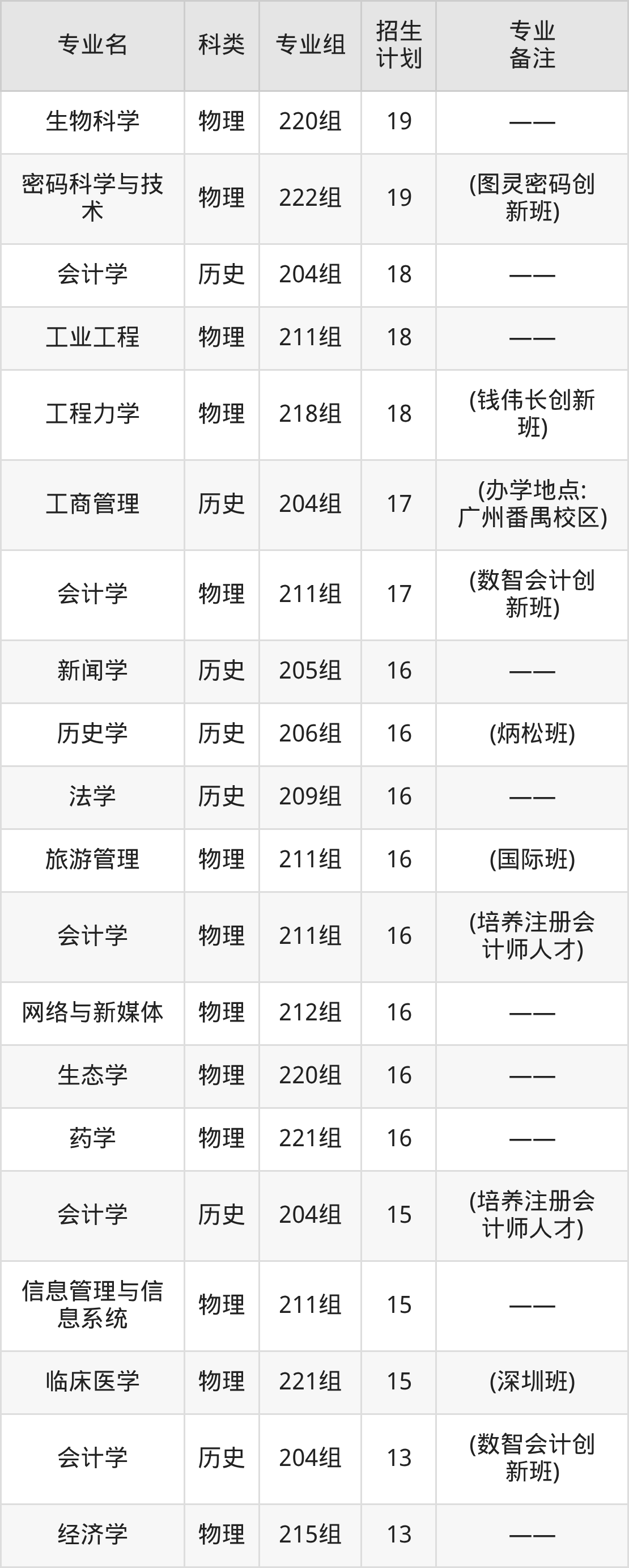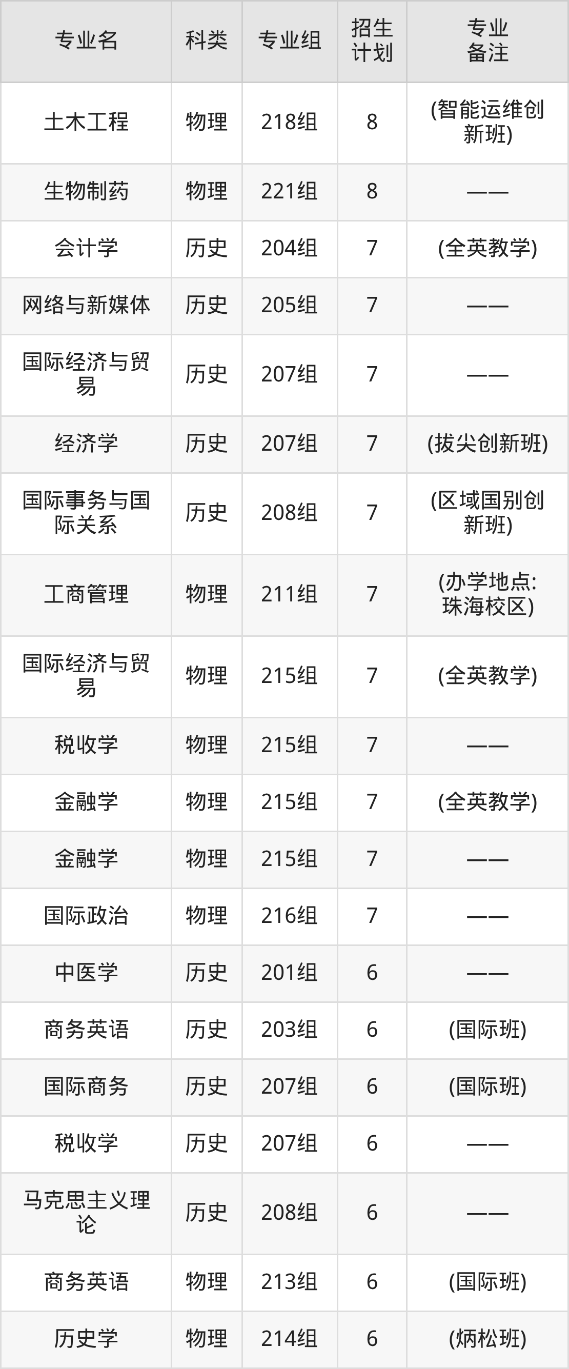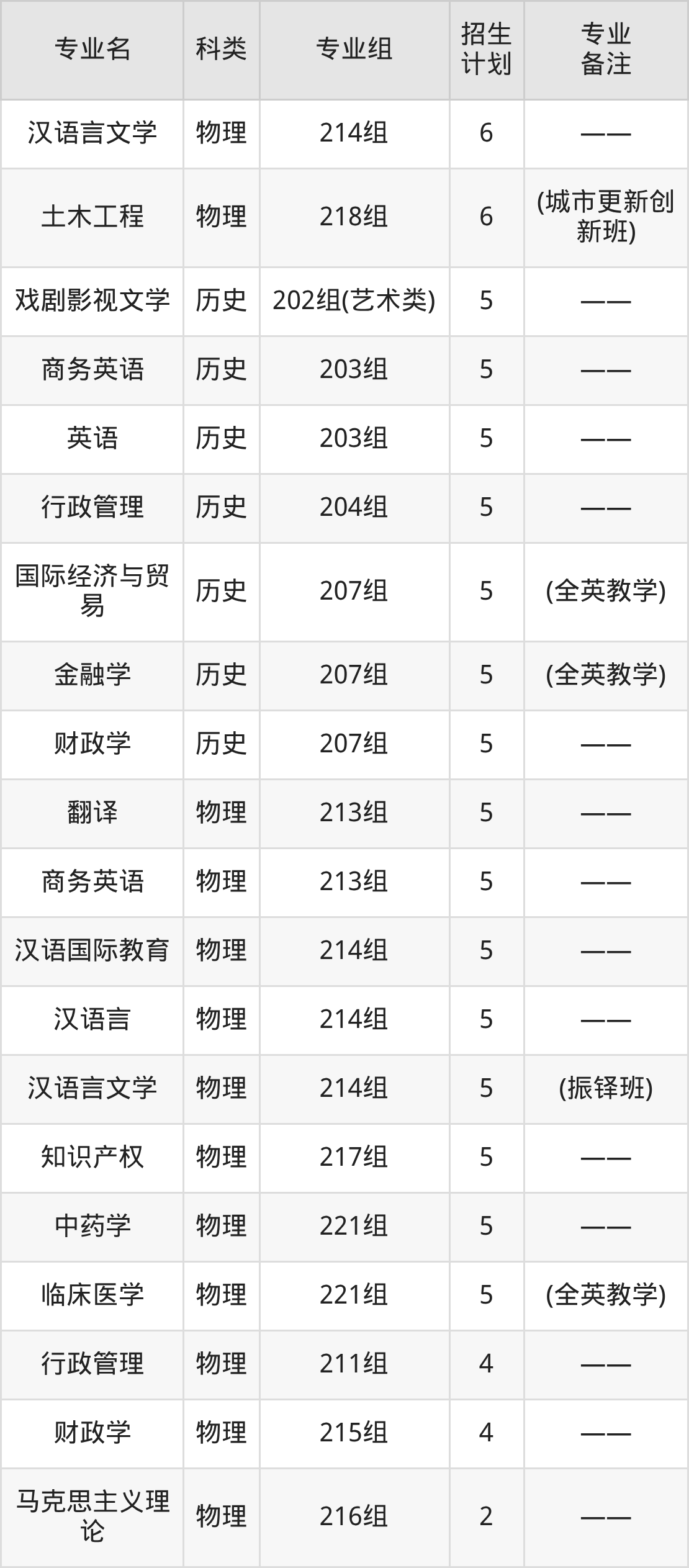值得注意的是,暨南大学在本科批、本科提前批招生,招生类型为物理类、历史类。篇幅有限,这里仅附上暨南大学在广东省内招生计划详情: