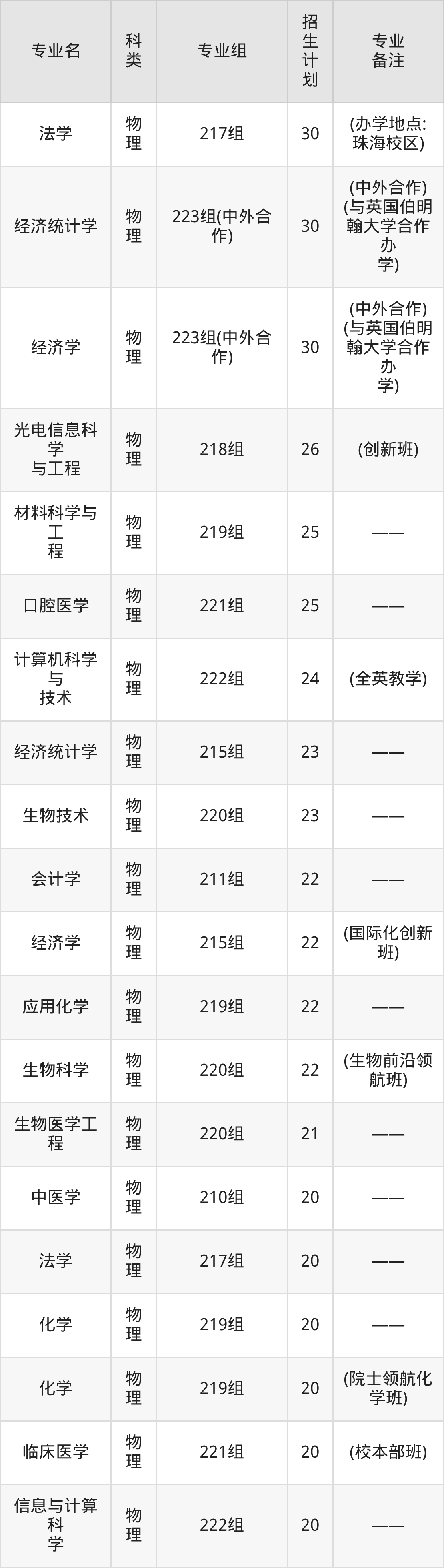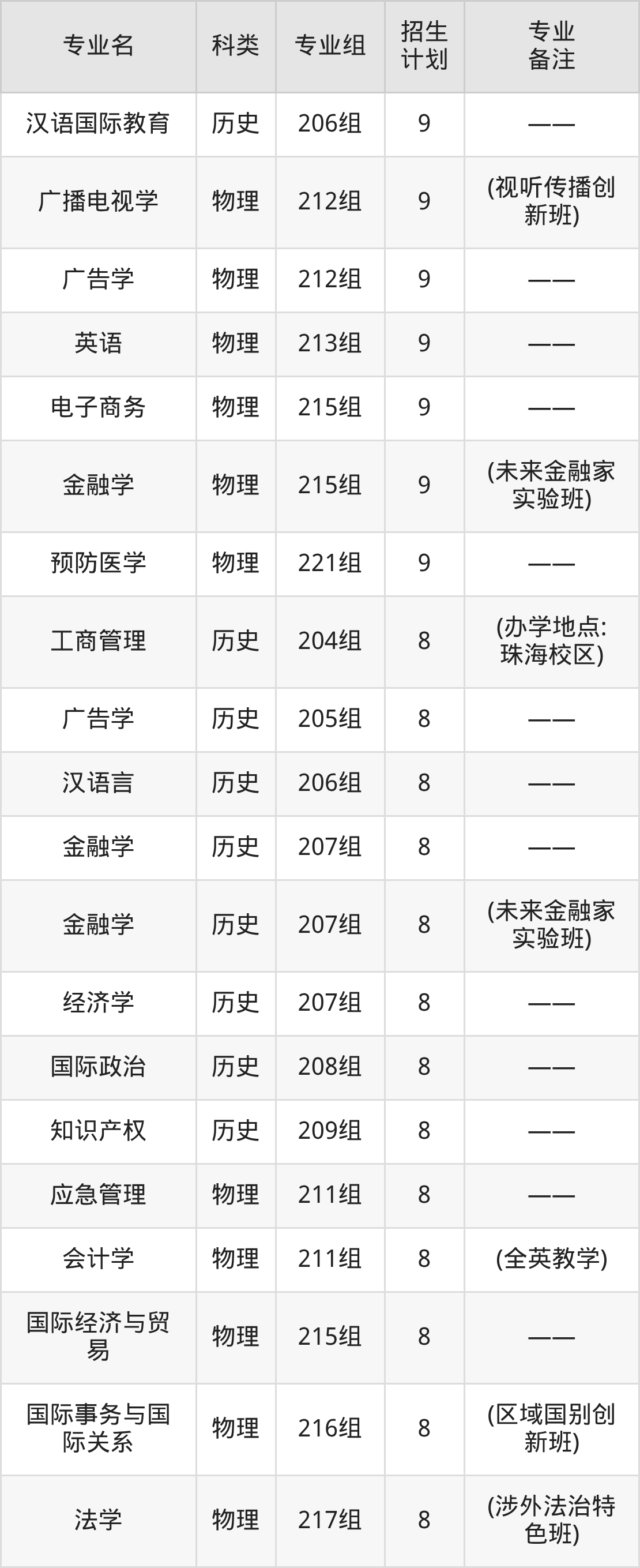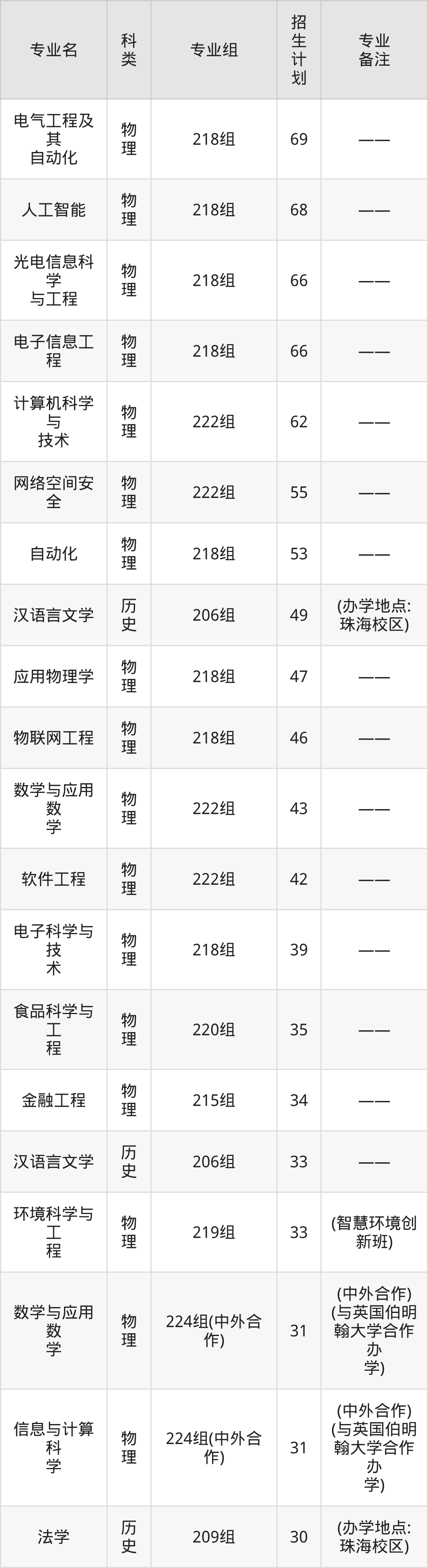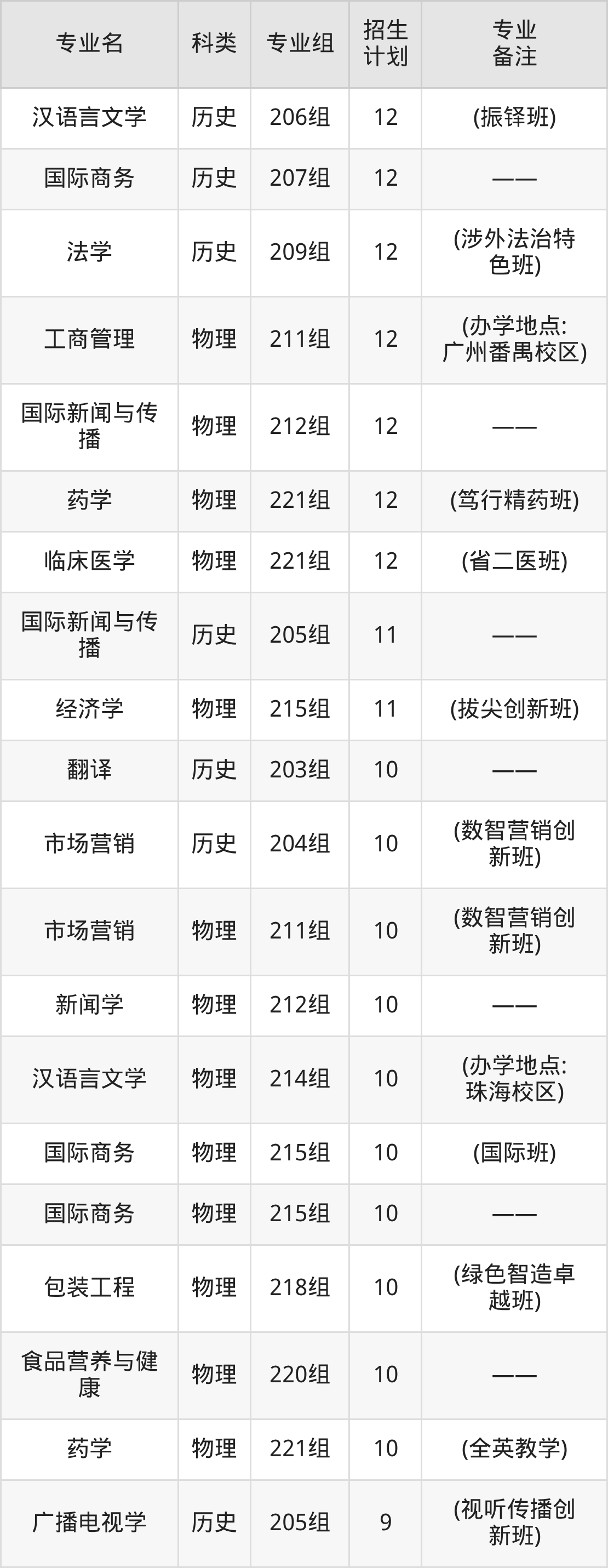 值得注意的是,暨南大学在本科批、本科提前批招生,招生类型为物理类、历史类。篇幅有限,这里仅附上暨南大学在广东省内招生计划详情: