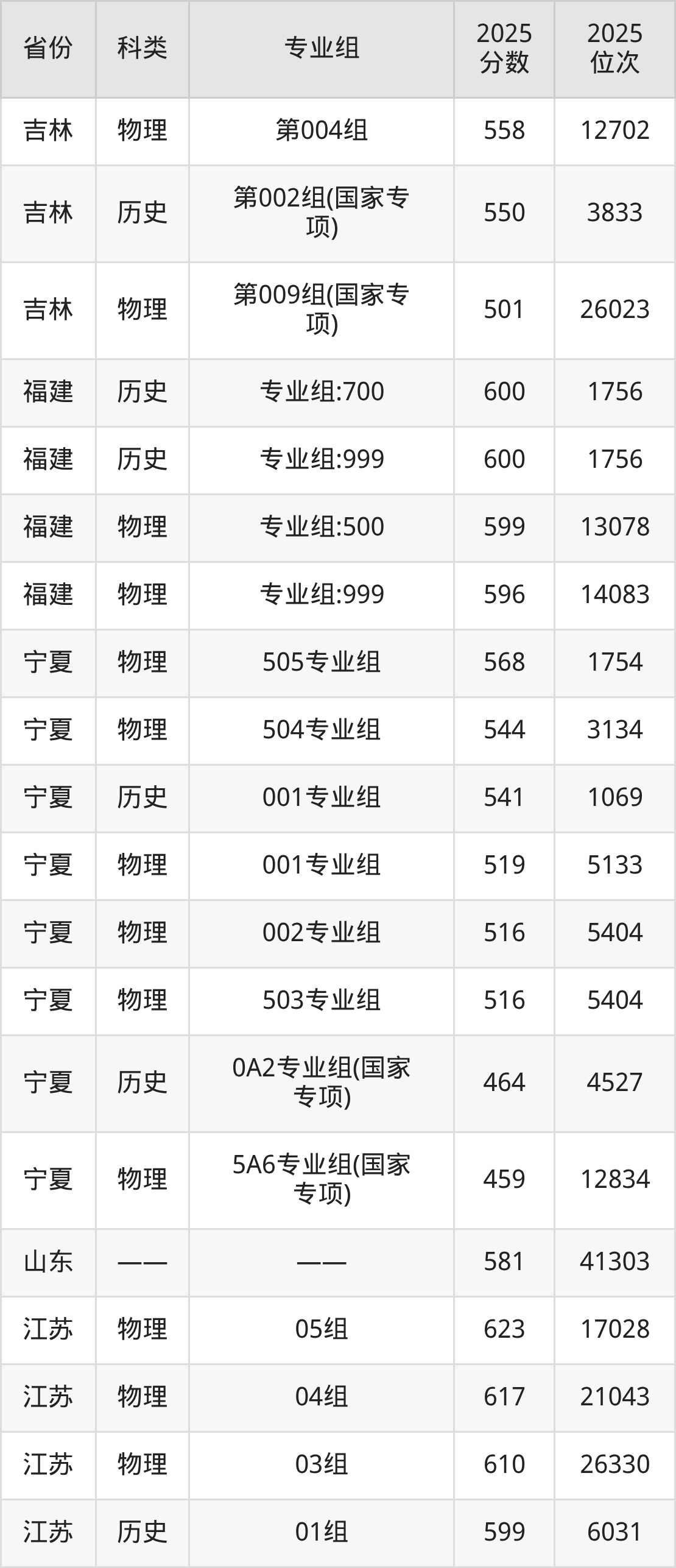 2、吉林:最低分501分,对应最低分专业组为物理类第009组(国家专项),位次26023名;