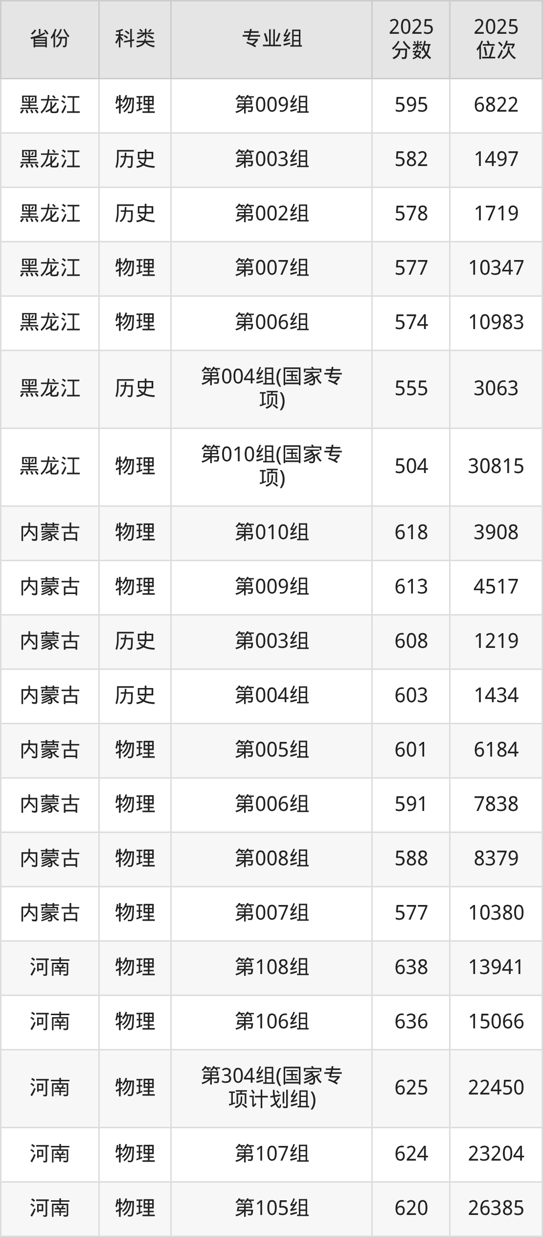 3、黑龙江:最低分504分,对应最低分专业组为物理类第010组(国家专项),位次30815名;