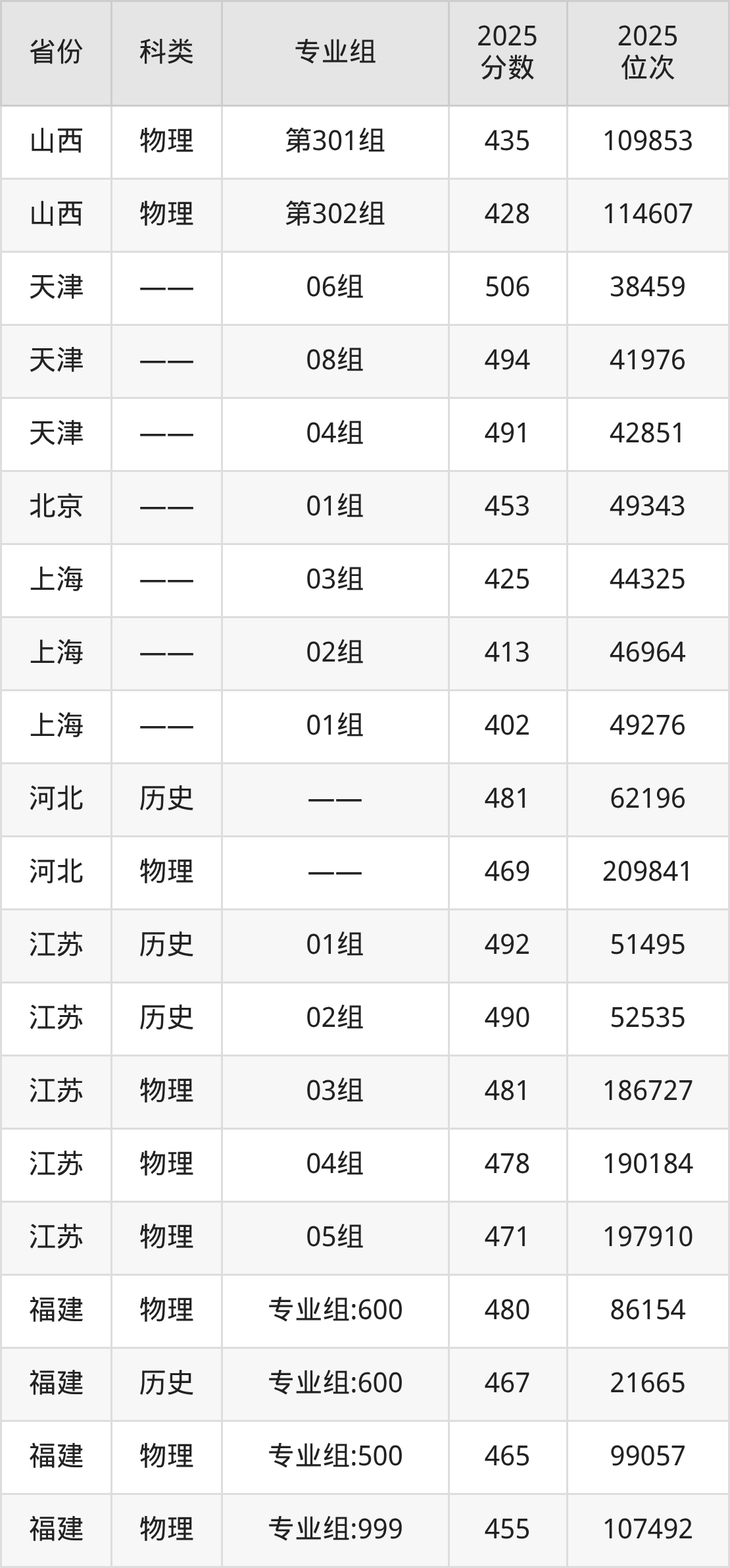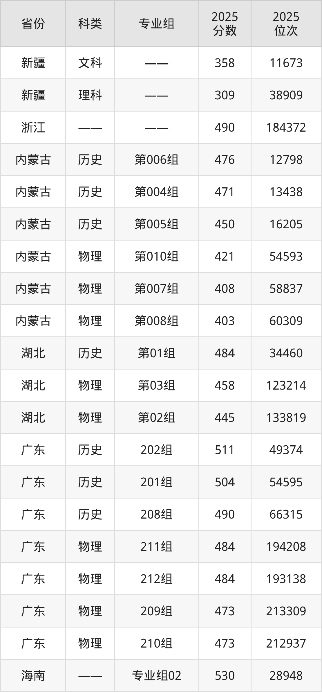 内蒙古最低403分、重庆最低425分、湖南最低427分、山西最低428分、江西最低442分、山东最低443分、四川最低444分、湖北最低445分、河南最低449分、福建最低450分、北京最低453分、河北最低469分、江苏最低471分、广东最低473分、安徽最低474分、浙江最低490分、天津最低491分、海南最低511分。