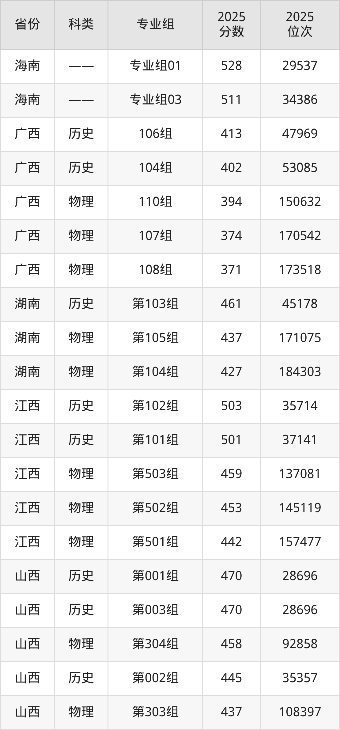 2、广西:最低分371分,对应最低分专业组为物理类108组,位次173518名;