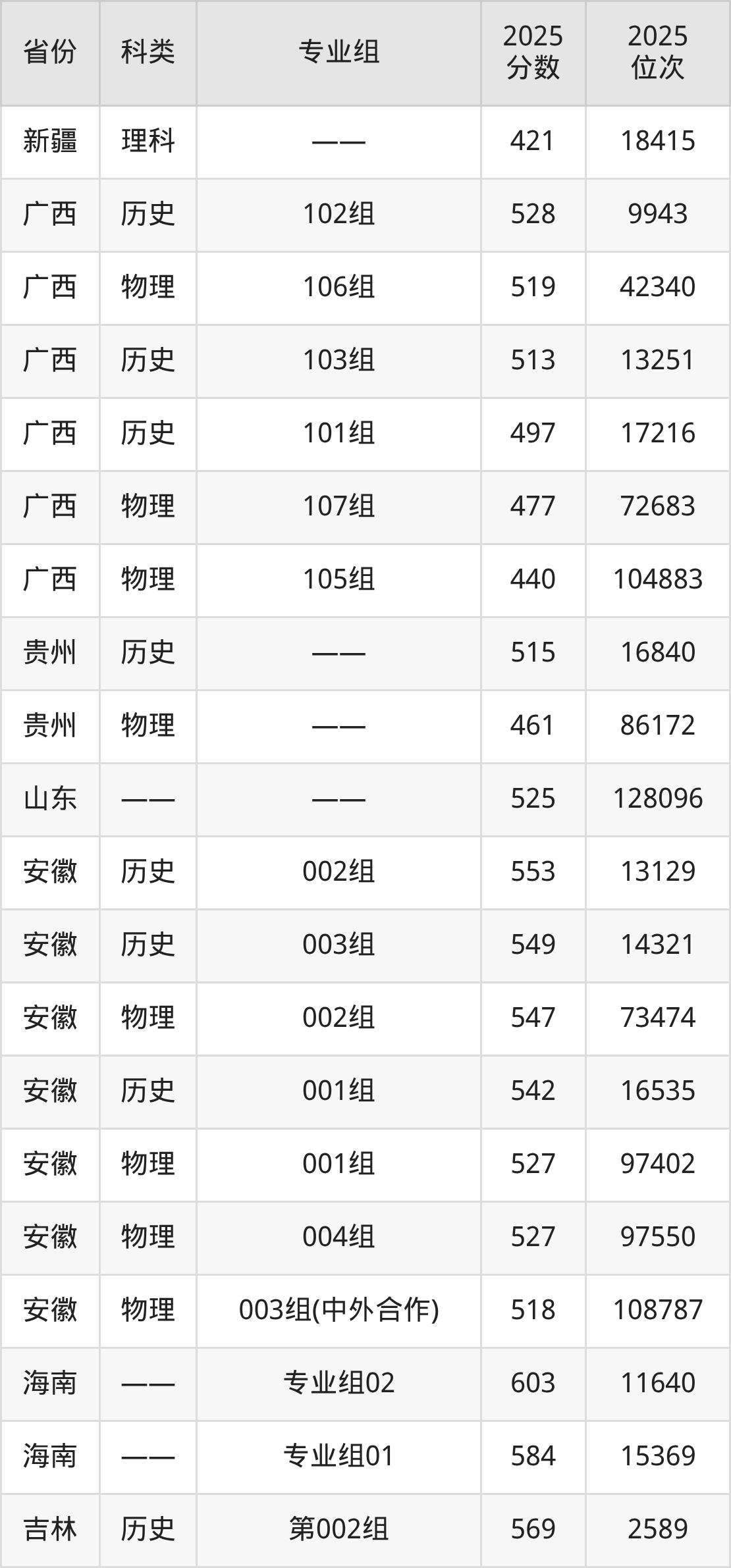 3、广西:最低分440分,对应最低分专业组为物理类105组,位次104883名;