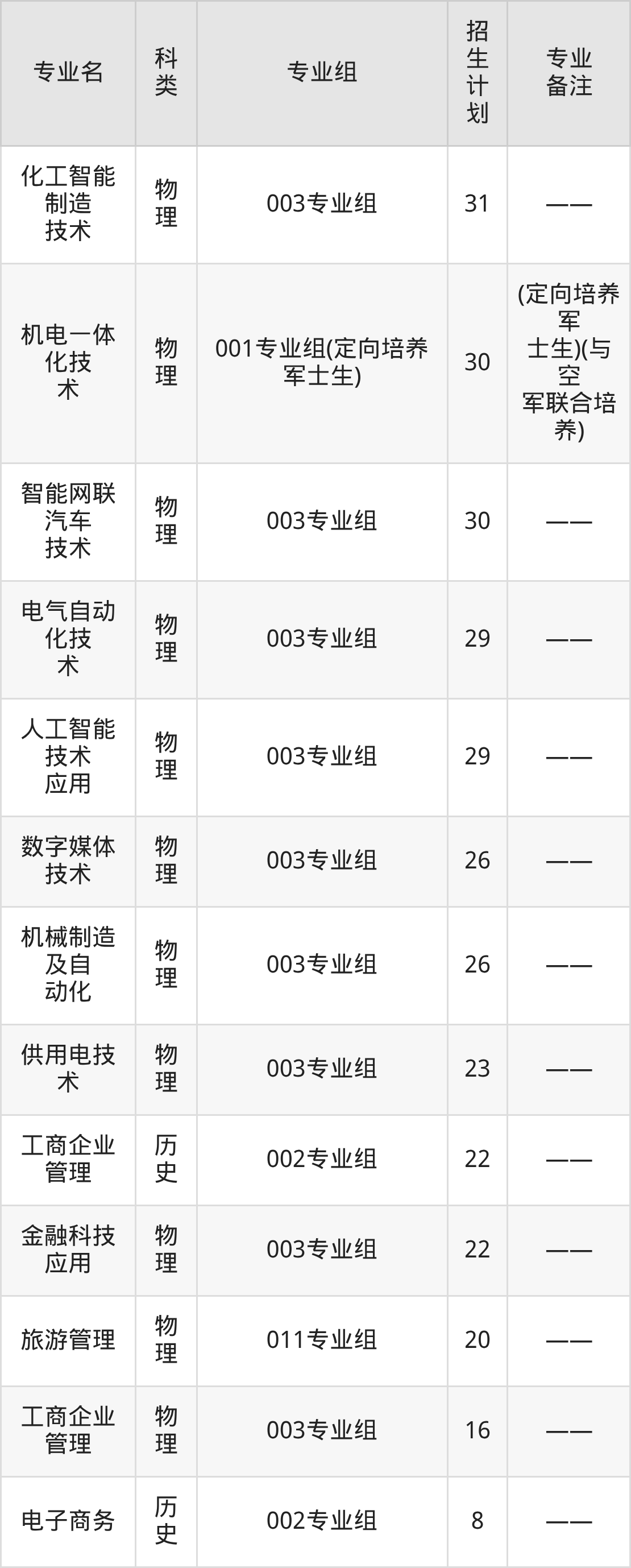 第三名:甘肃(40人),招生人数最多的专业是机电一体化技术(10人、物理类,(空军定向培养军士))。