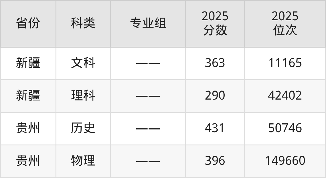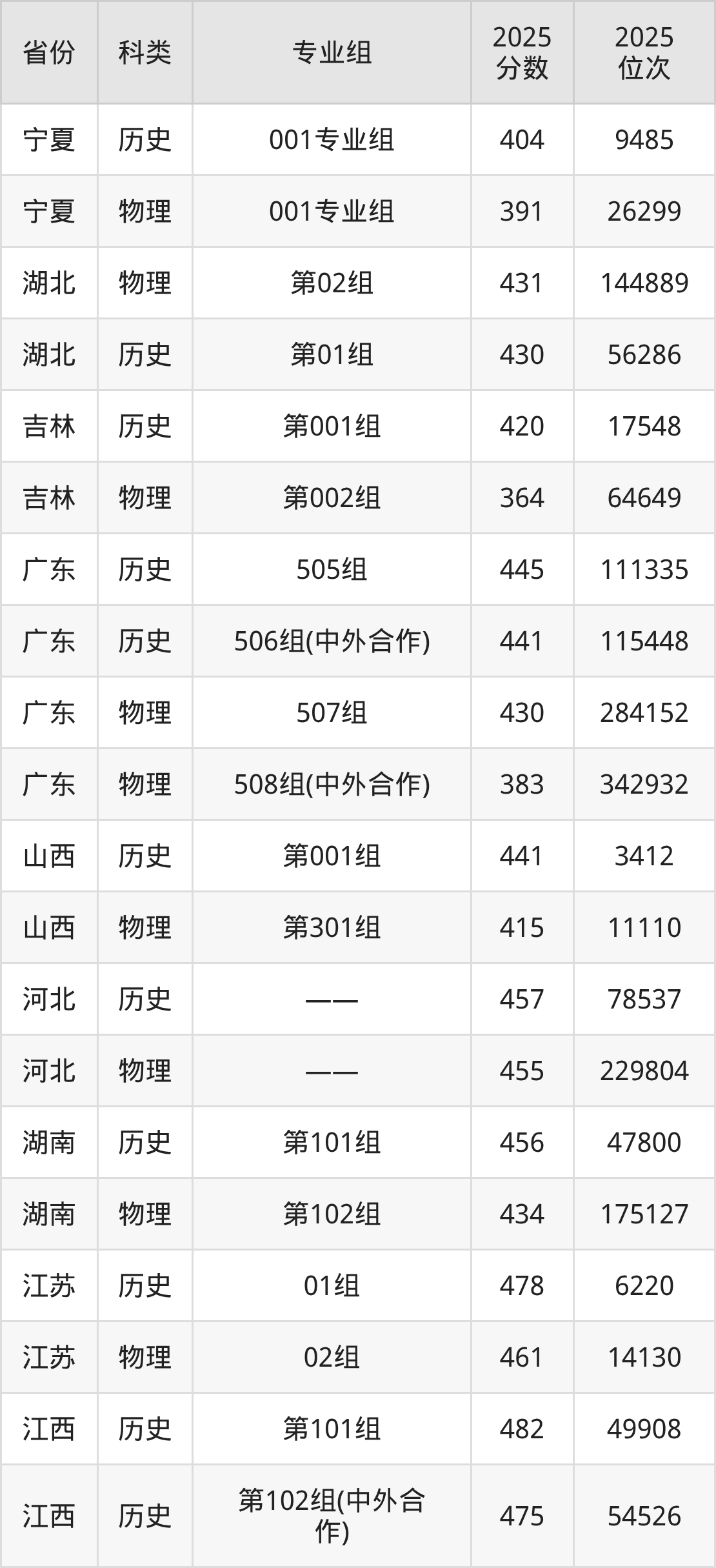 2025江西电力职业技术学院在各省录取最低分在290分到482分之间不等,其中分数门槛最低的是新疆,最高的是江苏。下面展示江西电力职业技术学院录取分数线最低的5个省份(含最低分专业组及位次):