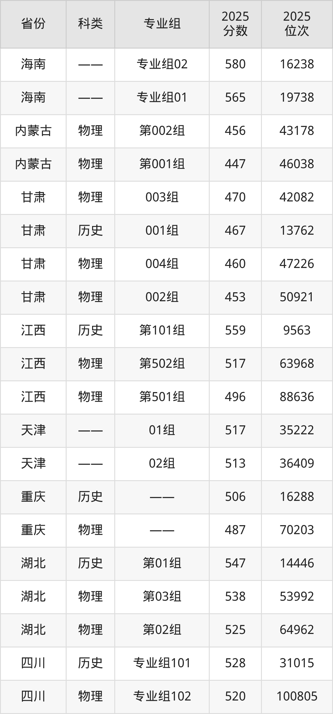 3、甘肃:最低分453分,对应最低分专业组为物理类002组,位次50921名;