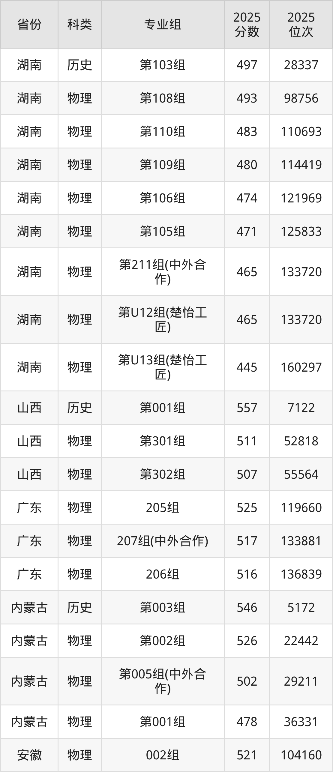 5、湖南:最低分445分,对应最低分专业组为物理类第U13组(楚怡工匠),位次160297名;
