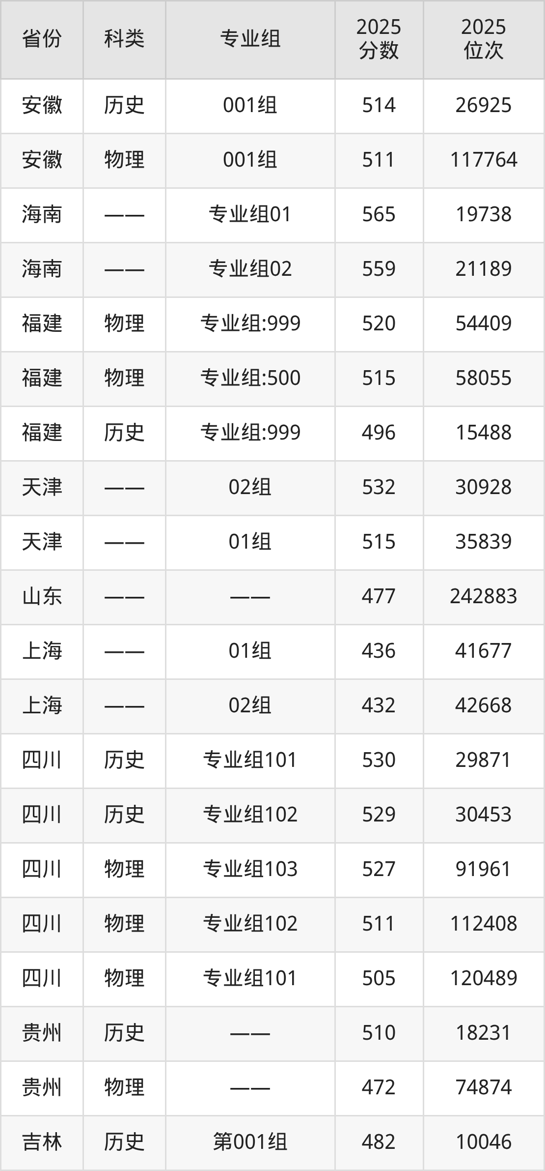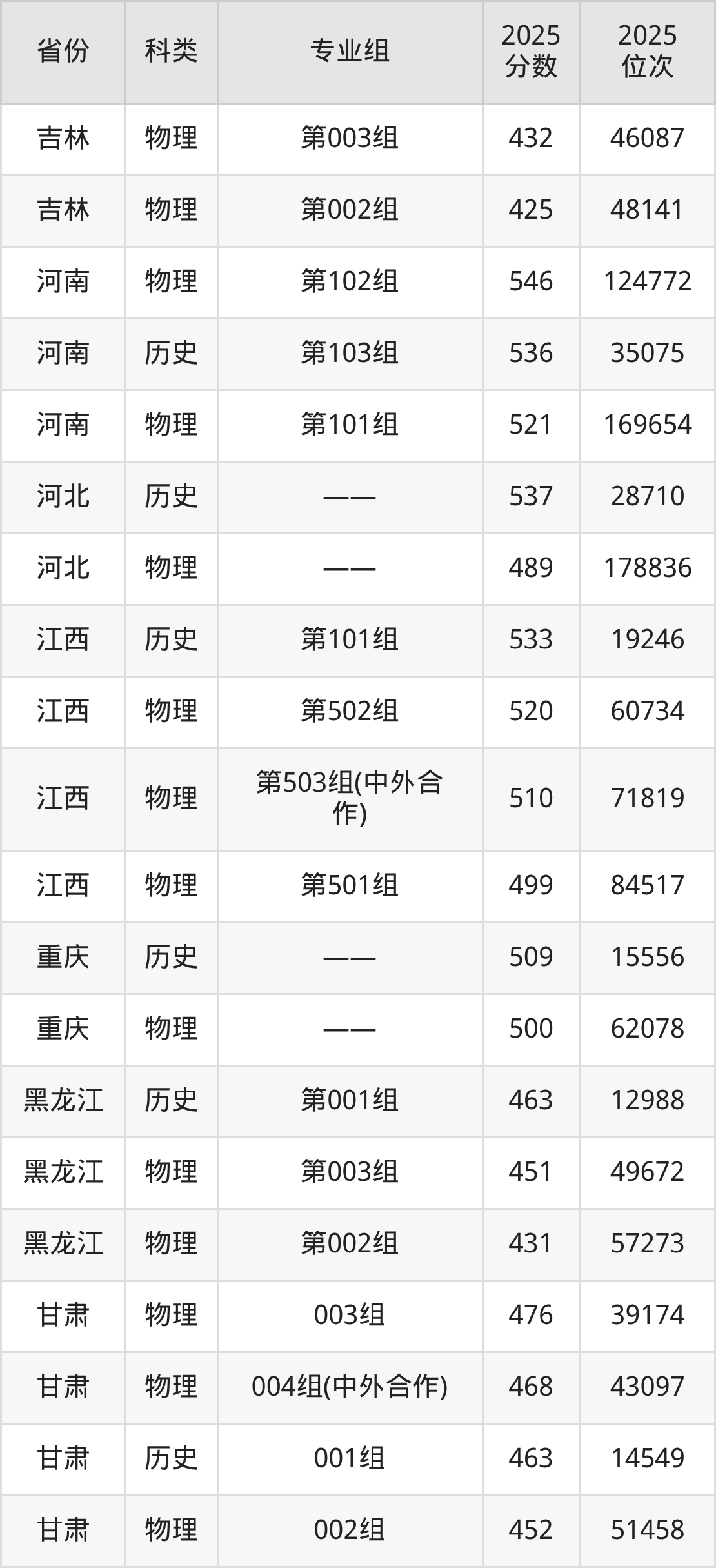 1、吉林:最低分425分,对应最低分专业组为物理类第002组,位次48141名;