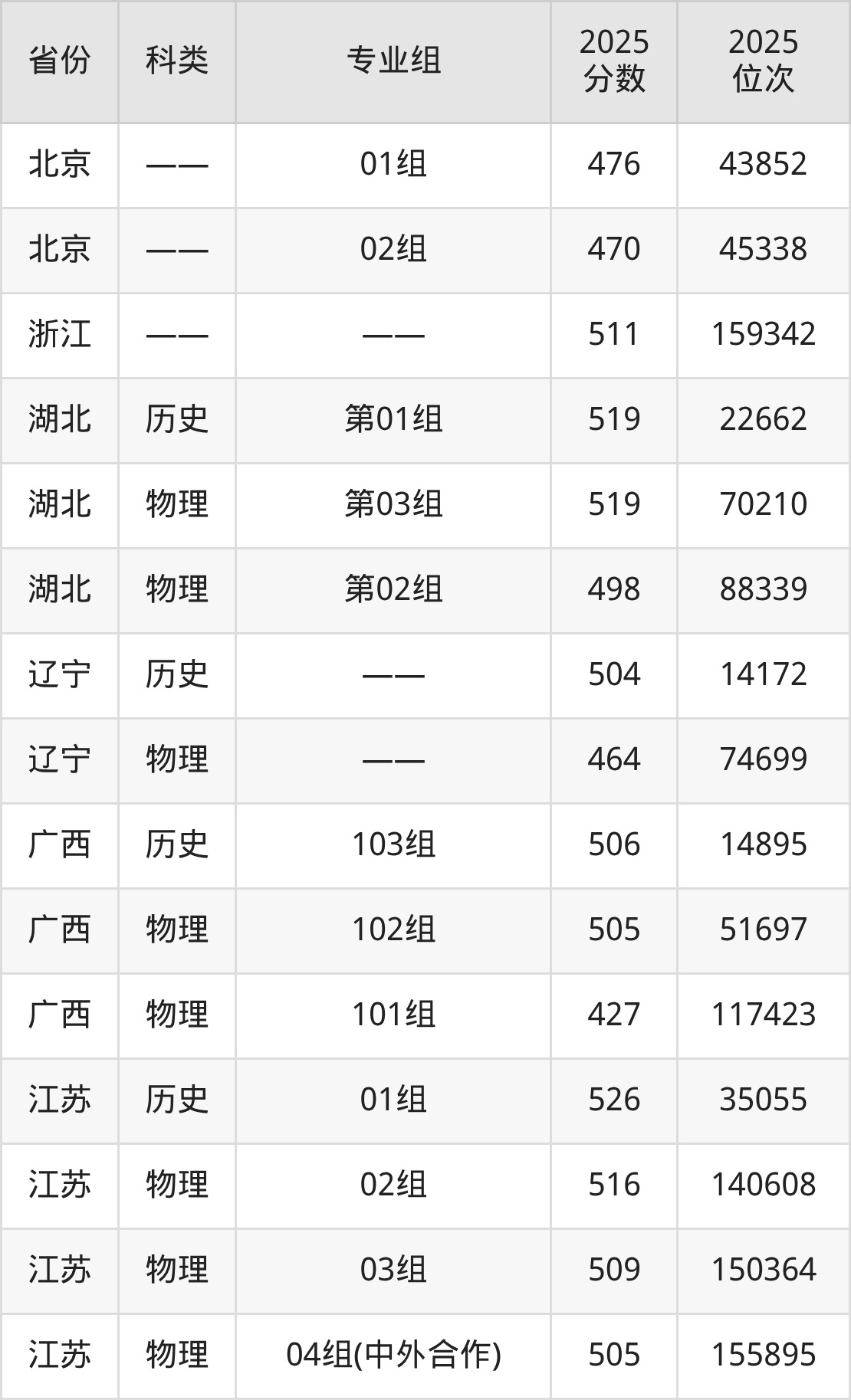 2025湖南工程学院在各省录取最低分在425分到565分之间不等,其中分数门槛最低的是吉林,最高的是海南。下面展示湖南工程学院录取分数线最低的5个省份(含最低分专业组及位次):