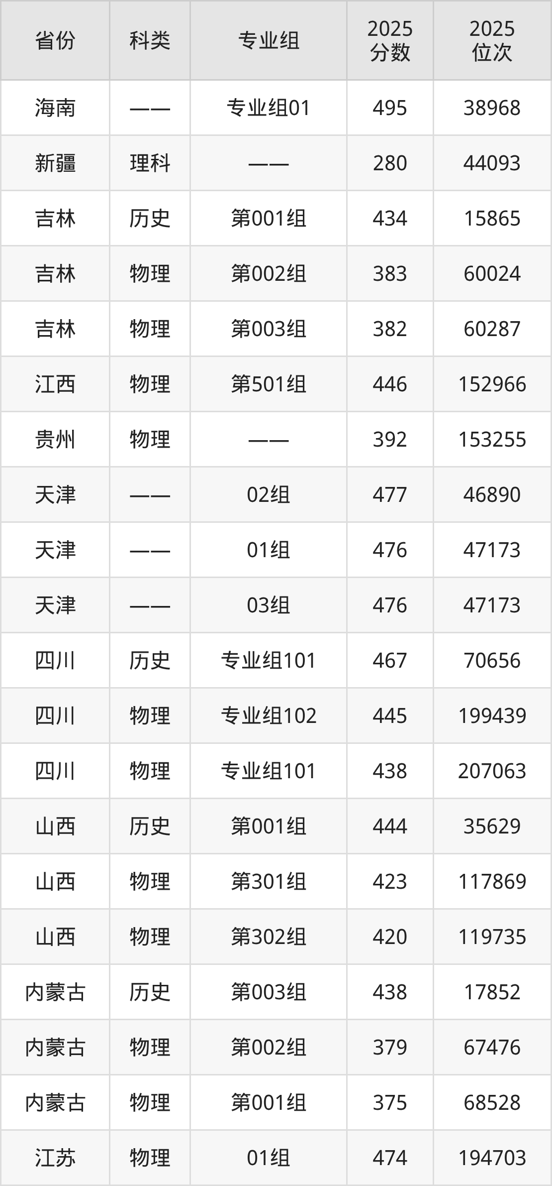 5、吉林:最低分382分,对应最低分专业组为物理类第003组,位次60287名;