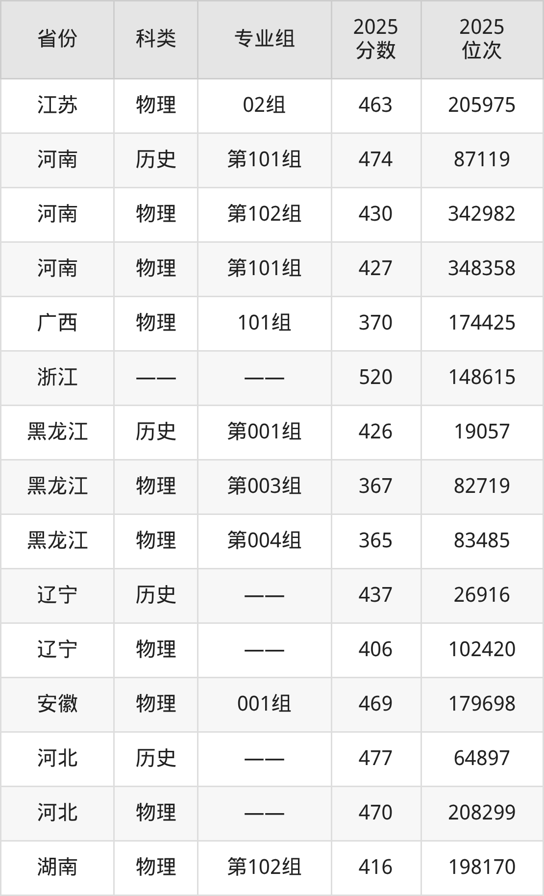2、黑龙江:最低分365分,对应最低分专业组为物理类第004组,位次83485名;