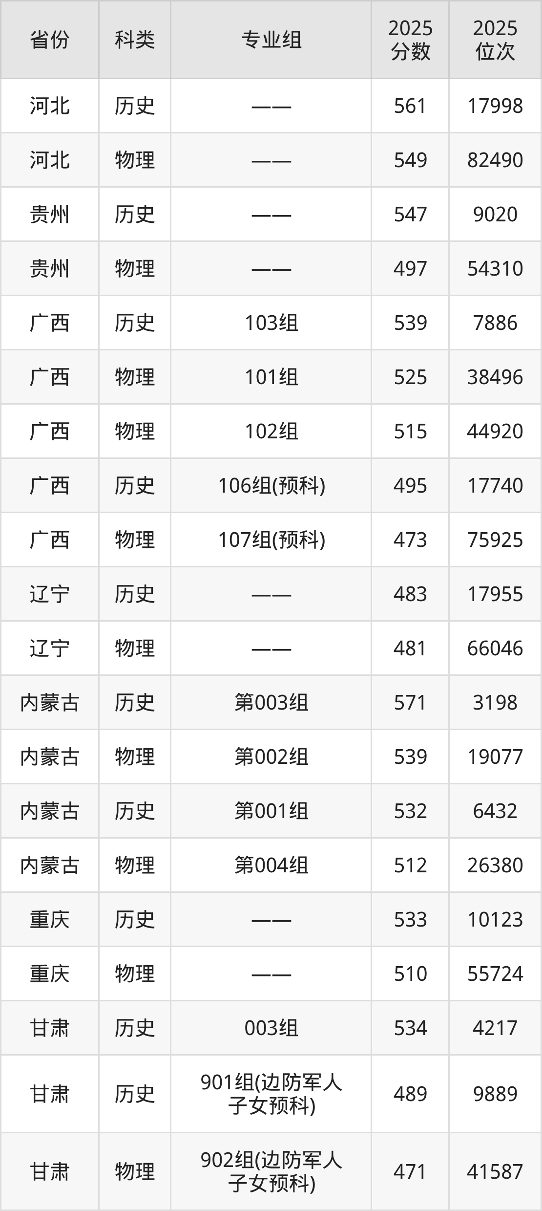 1、甘肃:最低分432分,对应最低分专业组为物理类004组,位次62505名;