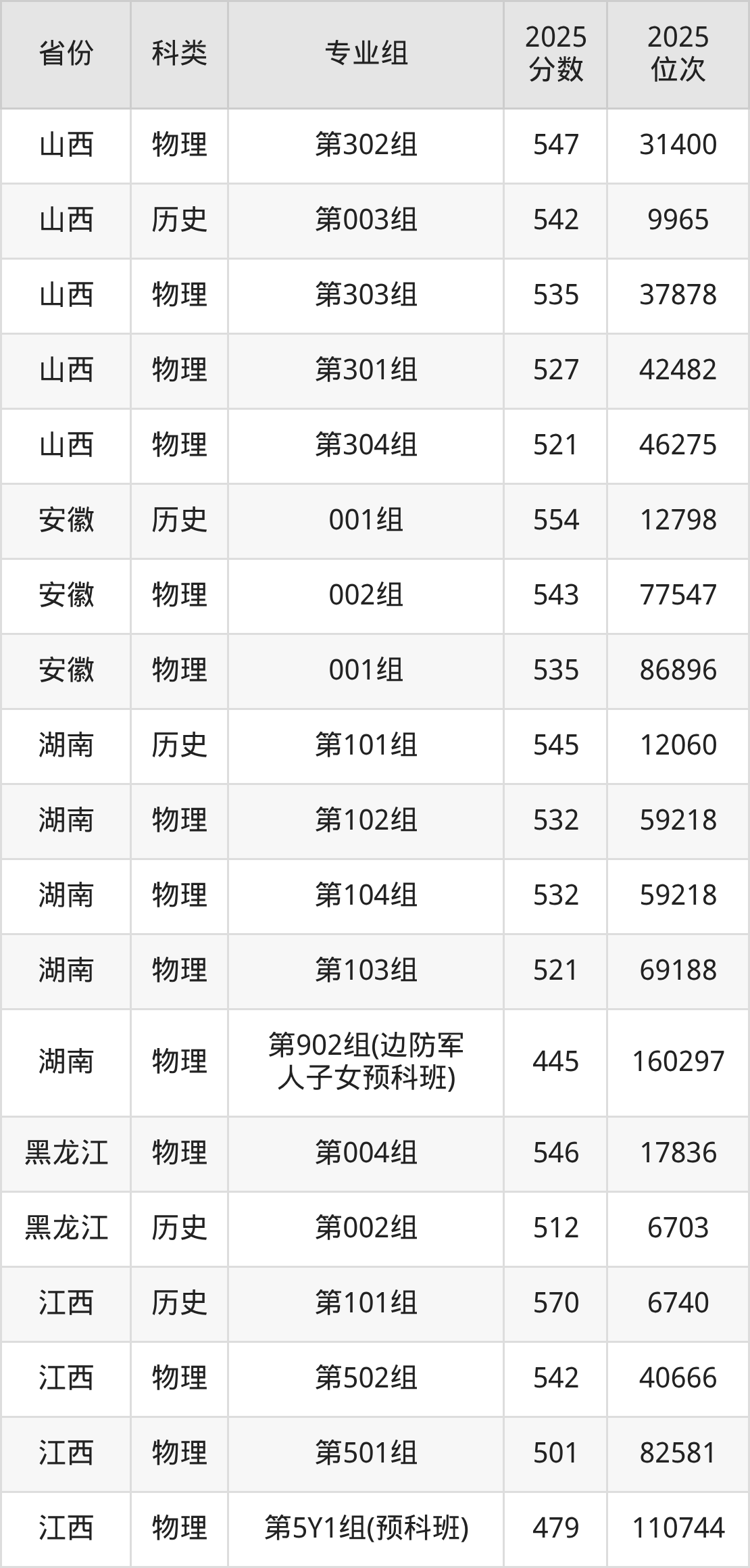 2、湖南:最低分445分,对应最低分专业组为物理类第902组(边防军人子女预科班),位次160297名;