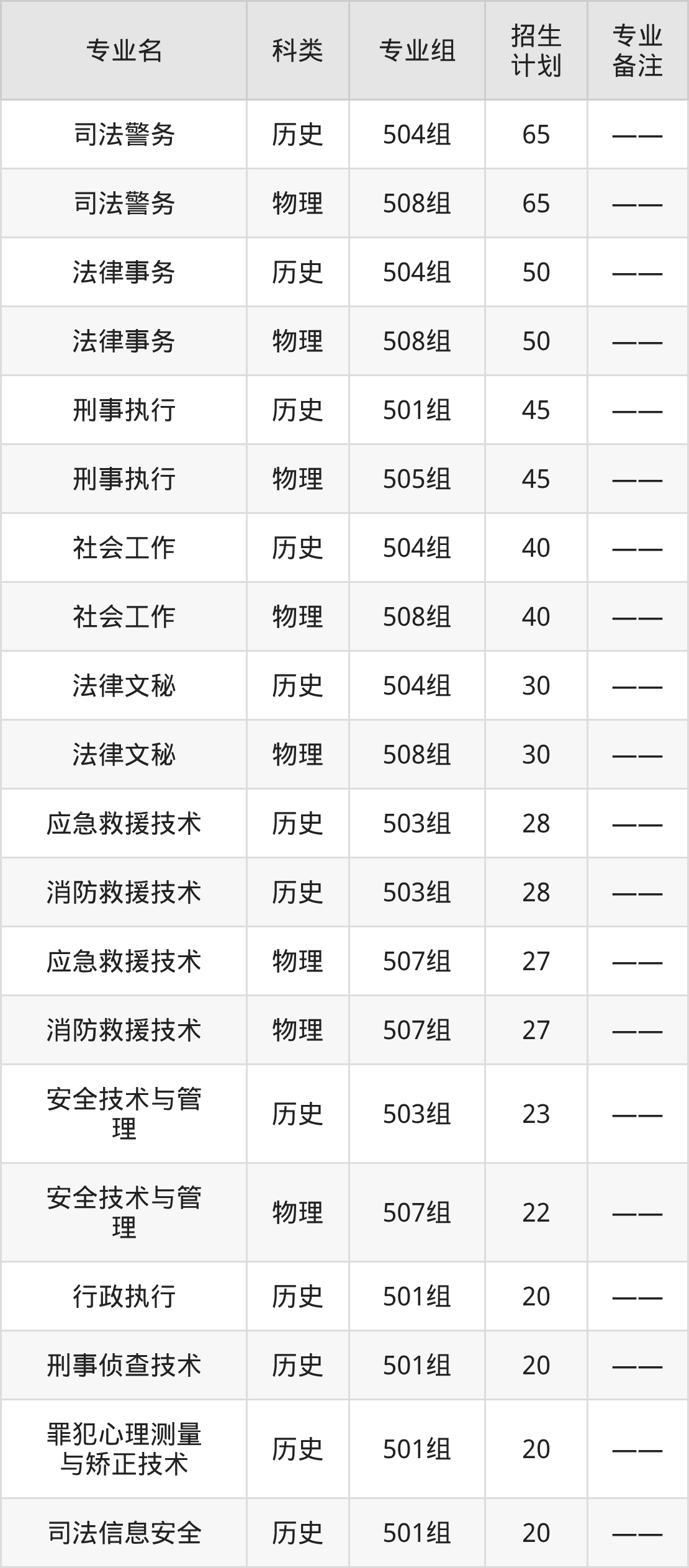 广东司法警官职业学院全国招生计划表显示: 在广东招1015人、河南招30人、广西招28人、新疆招18人、安徽招13人。