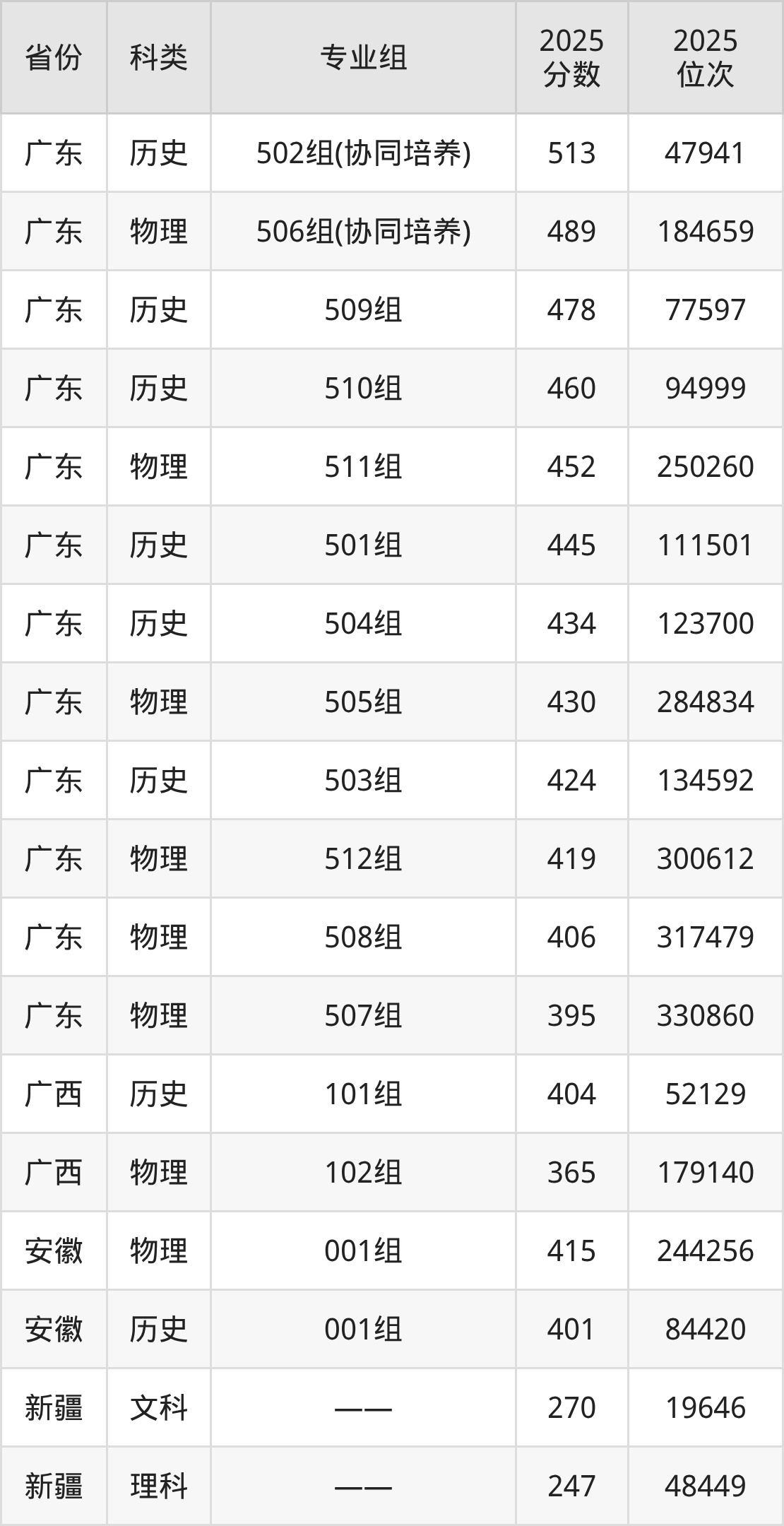 2025广东司法警官职业学院在各省录取最低分在247分到513分之间不等,其中分数门槛最低的是新疆,最高的是安徽。下面展示广东司法警官职业学院录取分数线最低的5个省份(含最低分专业组及位次):