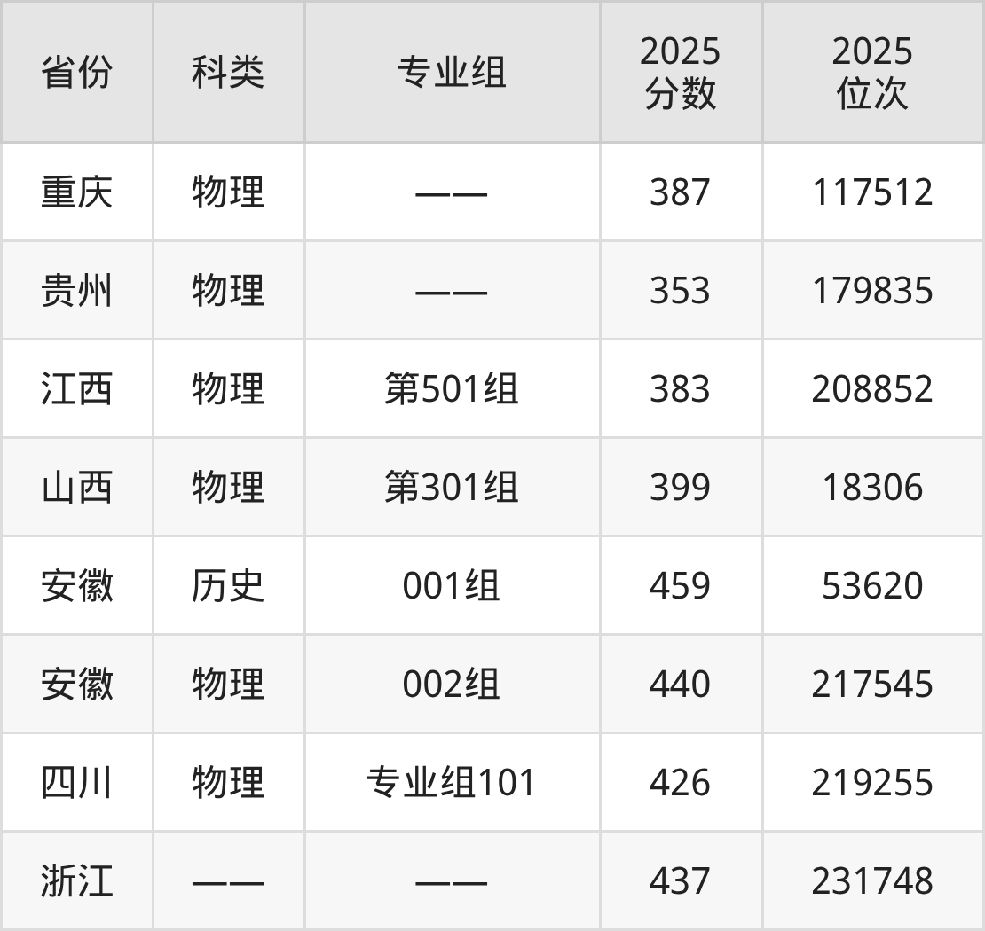 2、江西:最低分383分,对应最低分专业组为物理类第501组,位次208852名;