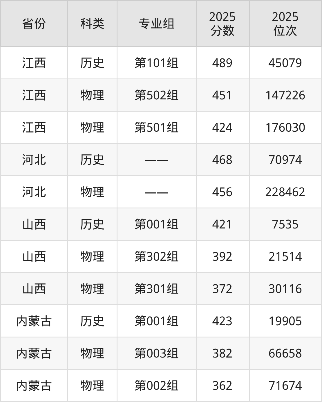 2、山西:最低分372分,对应最低分专业组为物理类第301组,位次30116名;