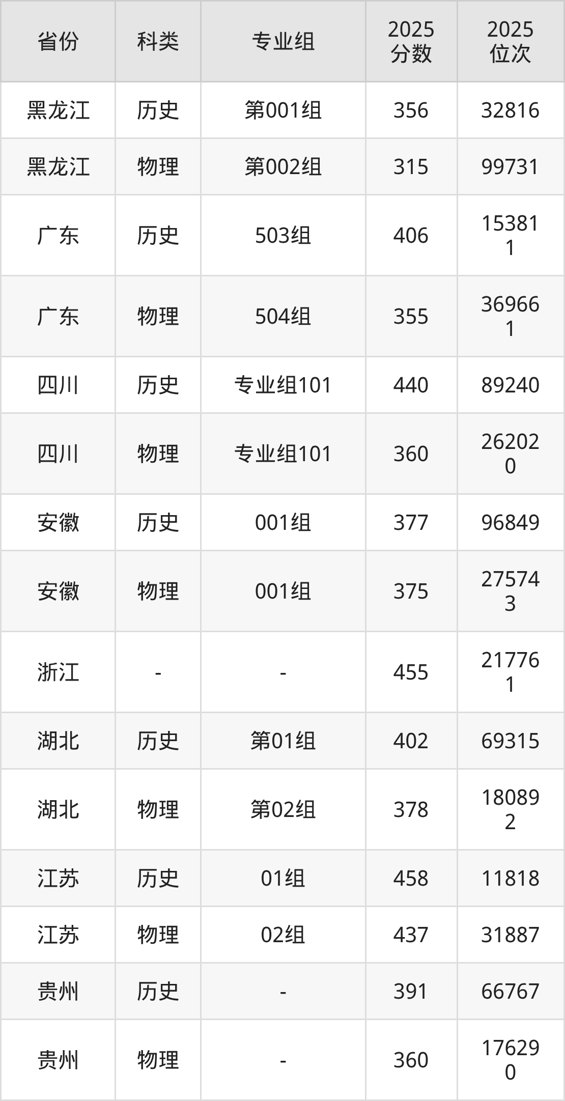 5、安徽:最低分375分,对应最低分专业组为物理类001组,位次275743名;