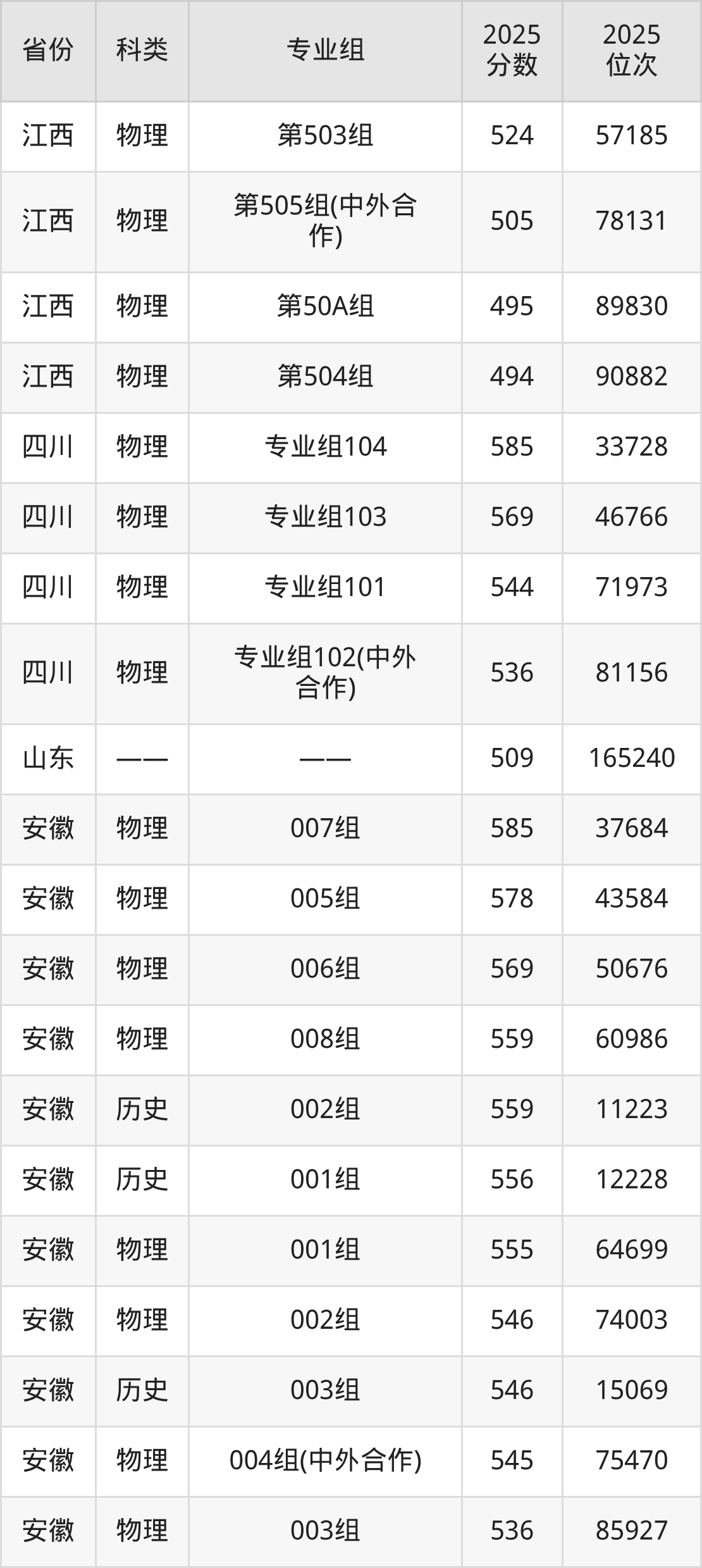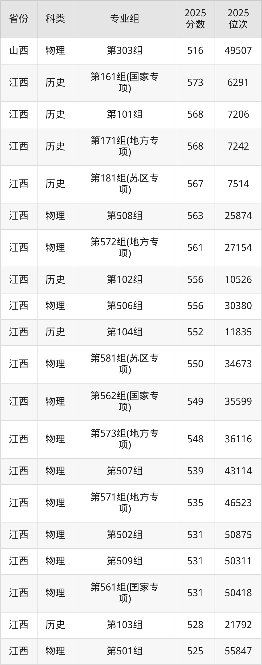 5、江西:最低分494分,对应最低分专业组为物理类第504组,位次90882名;