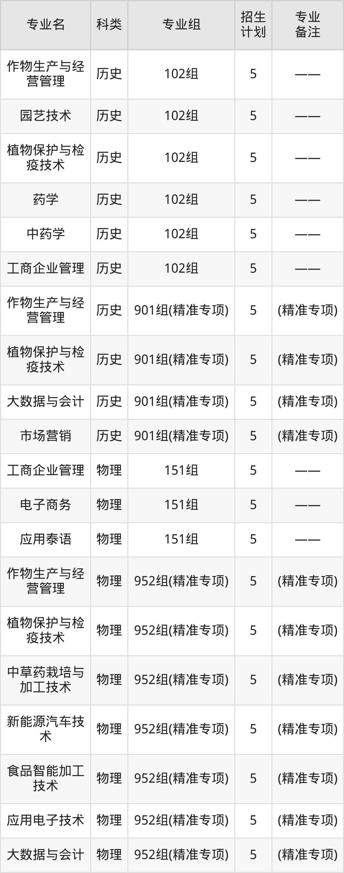 值得注意的是,广西农业职业技术大学在本科批、专科批招生,招生类型为物理类、历史类。篇幅有限,这里仅附上广西农业职业技术大学在广西壮族自治区内招生计划详情: