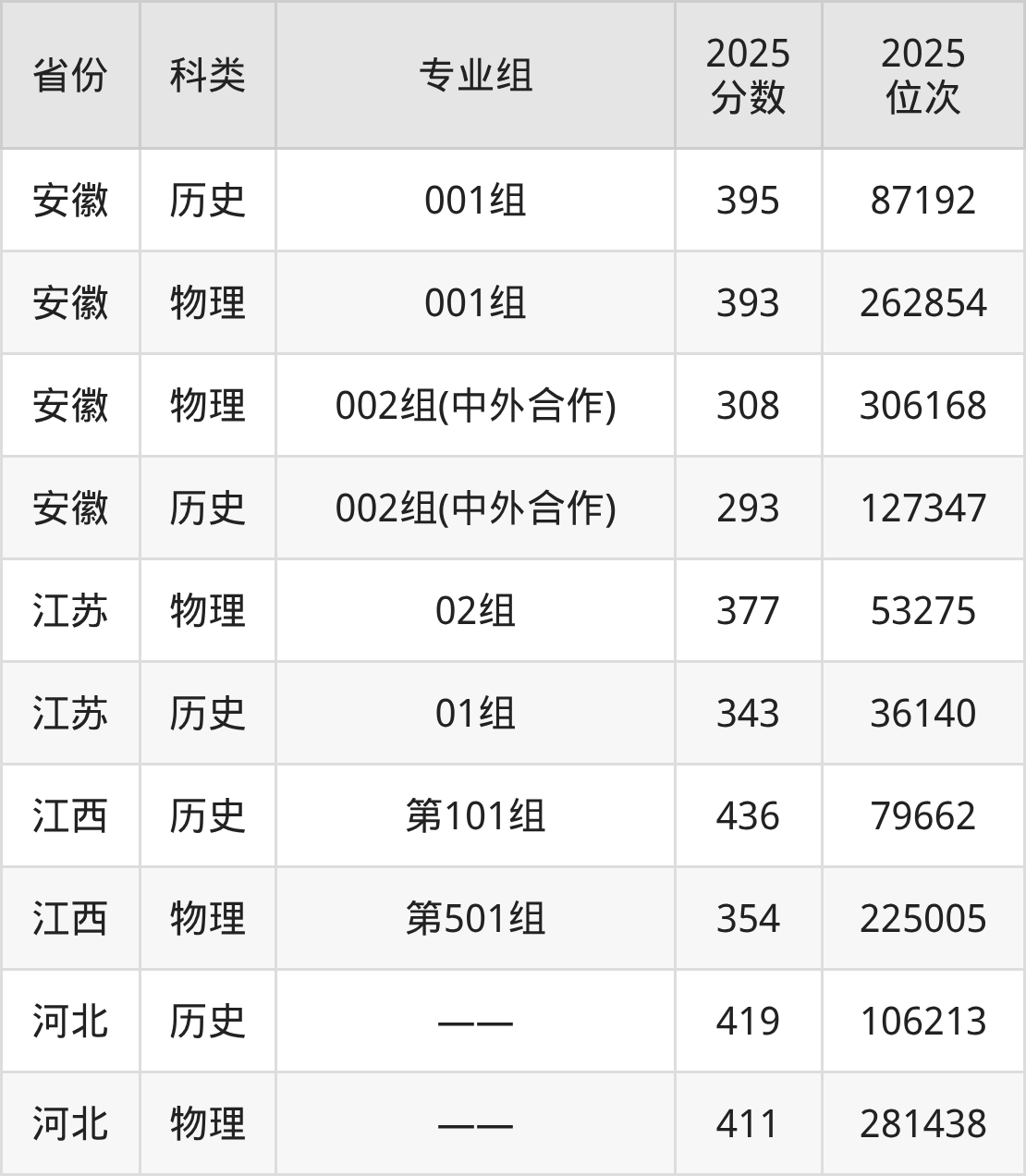 1、安徽:最低分293分,对应最低分专业组为历史类002组(中外合作),位次127347名;