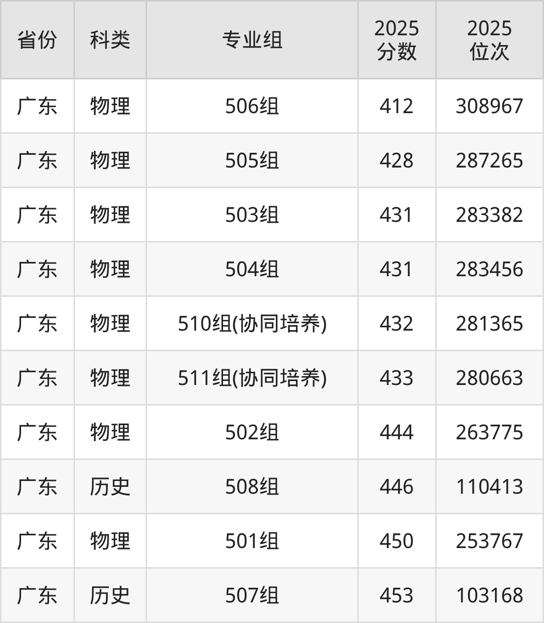 2025年佛山职业技术学院在广东省录取最低分为412分,对应最低分专业组为506组,位次在308967名及以内的物理类考生有机会被录取。而结合批次线来看,考生至少要超专科线197分才达院校收分门槛。