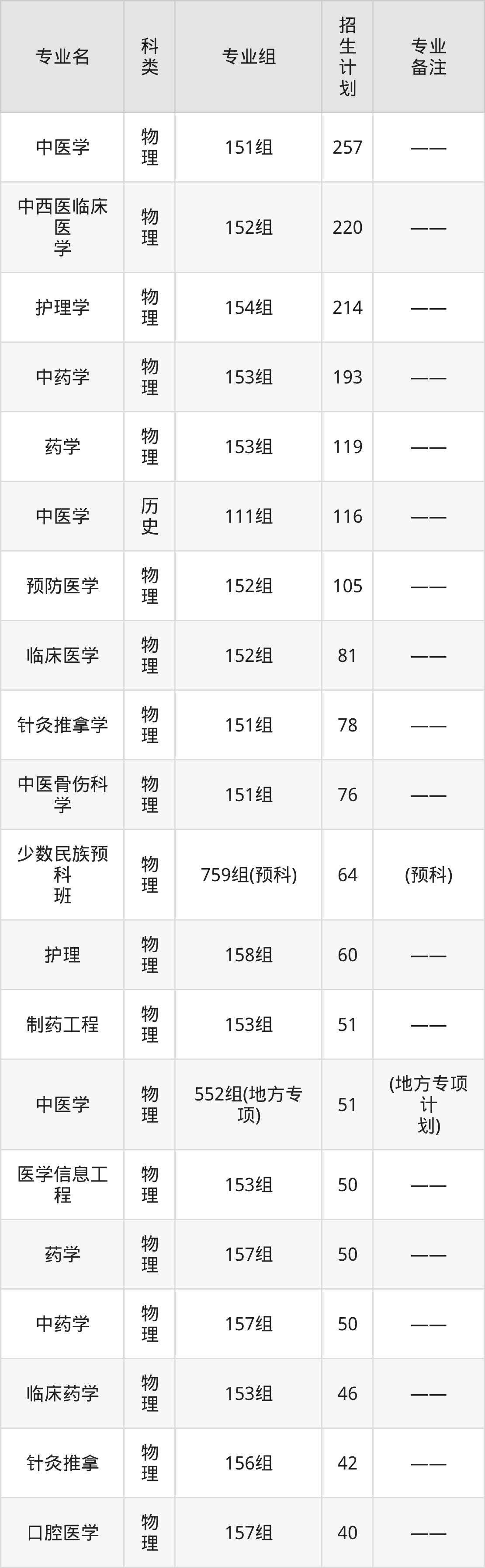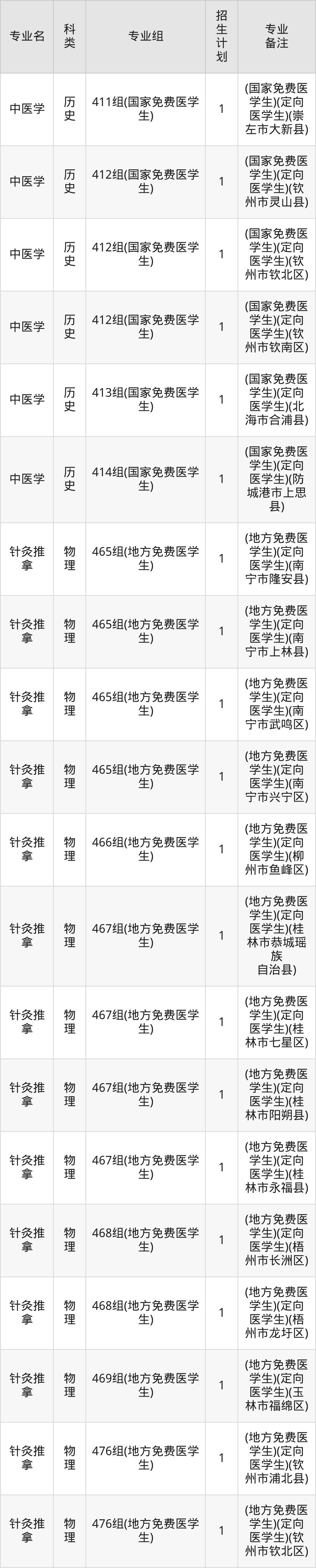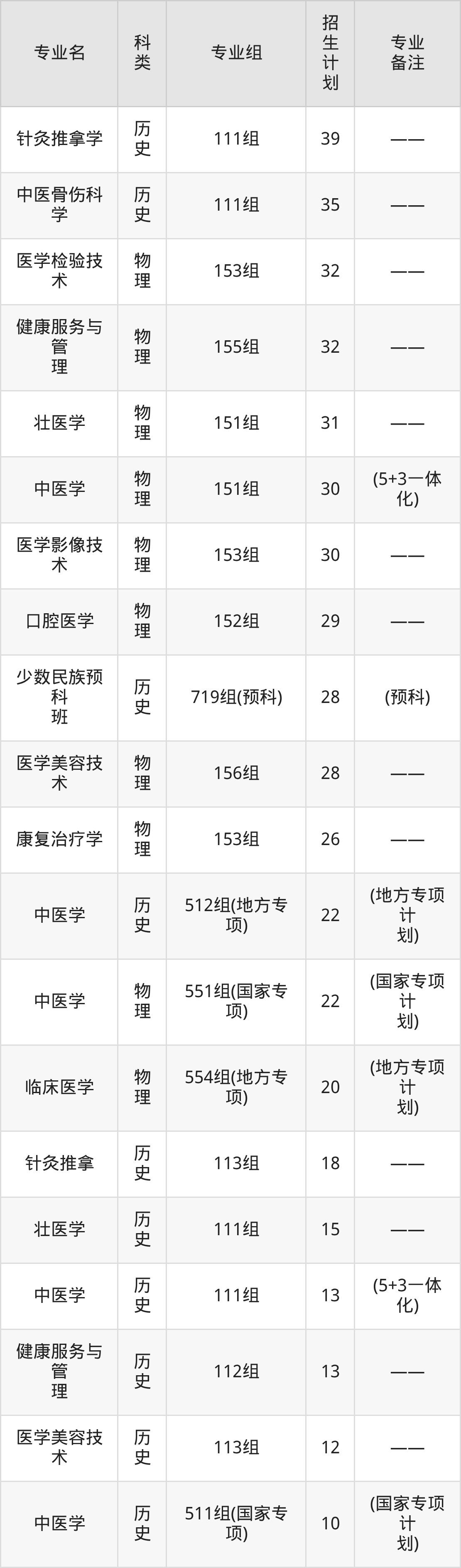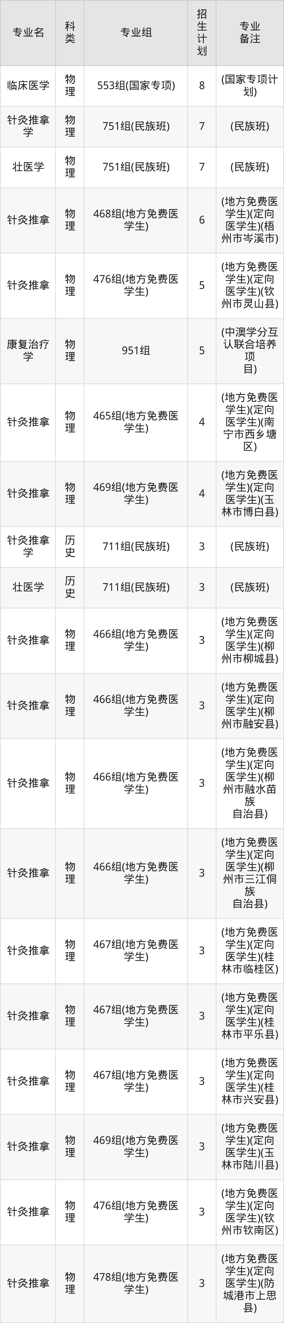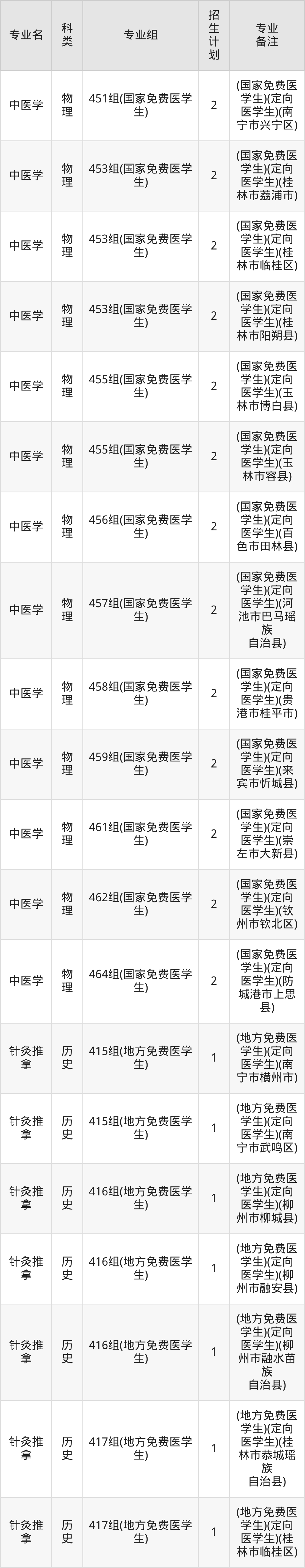 值得注意的是,广西中医药大学在本科批、专科批、专科提前批、本科提前批招生,招生类型为物理类、历史类。篇幅有限,这里仅附上广西中医药大学在广西壮族自治区内招生计划详情: