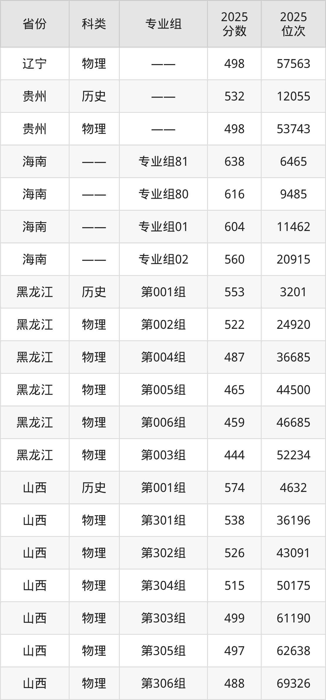 5、山西:最低分488分,对应最低分专业组为物理类第306组,位次69326名;
