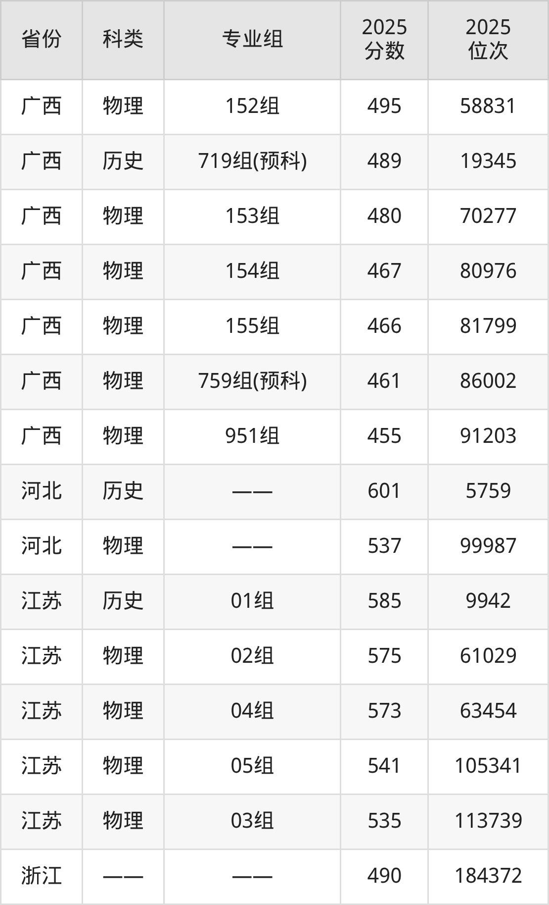 4、广西:最低分455分,对应最低分专业组为物理类951组,位次91203名;